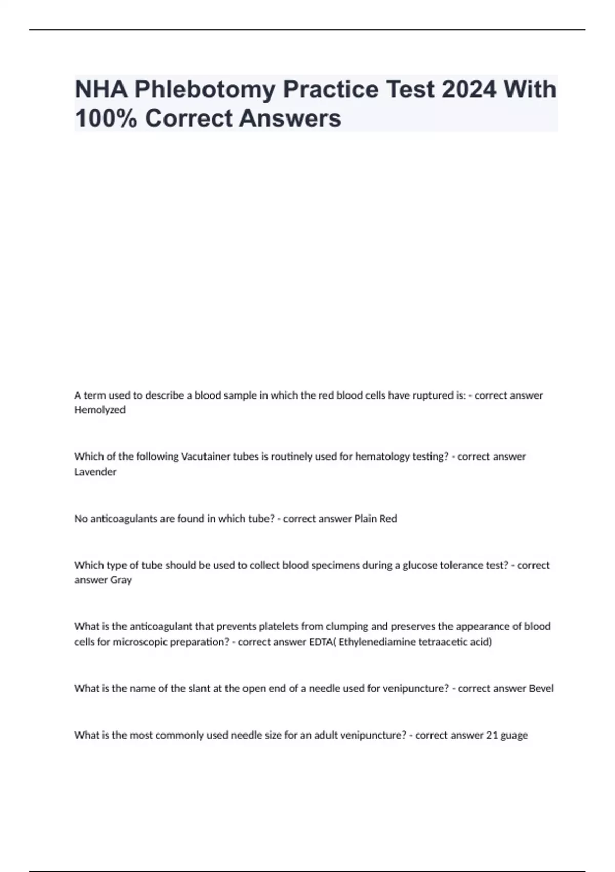 A term used to describe a blood sample in which the red blood cells have ruptured is: - correct answer Hemolyzed Which of the following Vacutainer tubes is routinely used for hematology testing? - correct answer Lavender No anticoagulants are found in which tube? - correct answer Plain Red Which type of tube should be used to collect blood specimens during a glucose tolerance test? - correct answer Gray What is the anticoagulant that prevents platelets from clumping and preserves the appearance of blood cells for microscopic preparation? - correct answer EDTA( Ethylenediamine tetraacetic acid) What is the name of the slant at the open end of a needle used for venipuncture? - correct answer Bevel What is the most commonly used needle size for an adult venipuncture? - correct answer 21 guage What is the most commonly used needle size for an infant and the elderly? - correct answer 23 guage How long