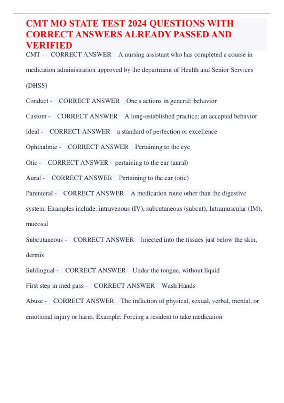 CMT MO STATE TEST 2024 QUESTIONS WITH CORRECT ANSWERS ALREADY PASSED AND VERIFIED CMT - CORRECT ANSWER A nursing assistant who has completed a course in medication administration approved by the department of Health and Senior Services (DHSS) Conduct - CORRECT ANSWER One's actions in general; behavior Custom - CORRECT ANSWER A long-established practice; an accepted behavior Ideal - CORRECT ANSWER a standard of perfection or excellence Ophthalmic - CORRECT ANSWER Pertaining to the eye Otic - CORRECT ANSWER pertaining to the ear (aural) Aural - CORRECT ANSWER Pertaining to the ear (otic) Parenteral - CORRECT ANSWER A medication route other than the digestive system. Examples include: intravenous (IV), subcutaneous (subcut), Intramuscular (IM), mucosal Subcutaneous - CORRECT ANSWER Injected into the tissues just below the skin, dermis Sublingual - CORRECT ANSWER Under the tongue, without liquid First step in med pass - CORRECT ANSWER Wash Hands Abuse - CORRECT ANSWER The infliction of physical, sexual, verbal, mental, or emotional injury or harm. Example: Forcing a resident to take medication CMT MO STATE TEST 2024 QUESTIONS WITH CORRECT ANSWERS ALREADY PASSED AND VERIFIED Assault - CORRECT ANSWER Threat or attempt to injure another in an unlawful manner. Example: Telling a resident,"If youre not quiet, I'll tie your hands down" Battery - CORRECT ANSWER Unlawful application of force to the person of another. Example: Carrying out a threat Invasion of privacy - CORRECT ANSWER A civil wrong that unlawfully makes public knowledge of any private or personal information without the consent of the wronged person. False imprisonment - CORRECT ANSWER unjustified detention of a person. Example: Preventing a competent resident from leaving a facility. Libel - CORRECT ANSWER A false and malicious publication in writing about an individual or group to a third party. Malpractice - CORRECT ANSWER Improper or negligent treatment of a resident or patient resulting in damage or injury. Example: The CMT gives medications to the wrong resident and does not report the error to the nurse. Neglect - CORRECT ANSWER Failure of person responsible for an individual to provide necessary services to maintain physical and mental health of the individual, when such failure presents an imminent or probable danger or death to the individual. Example: walking away from a resident's bedside without putting the side rails up when side rail use is ordered by the physician and is included in the care plan.