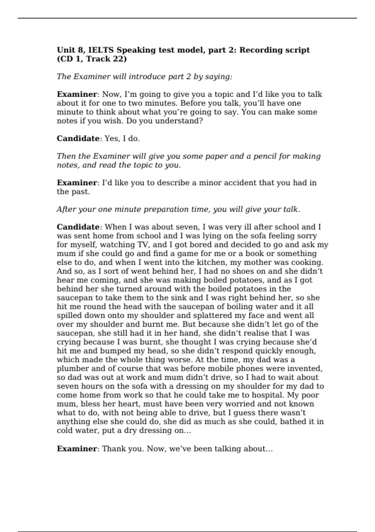 Unit 8, IELTS Speaking test model, part 2: Recording script