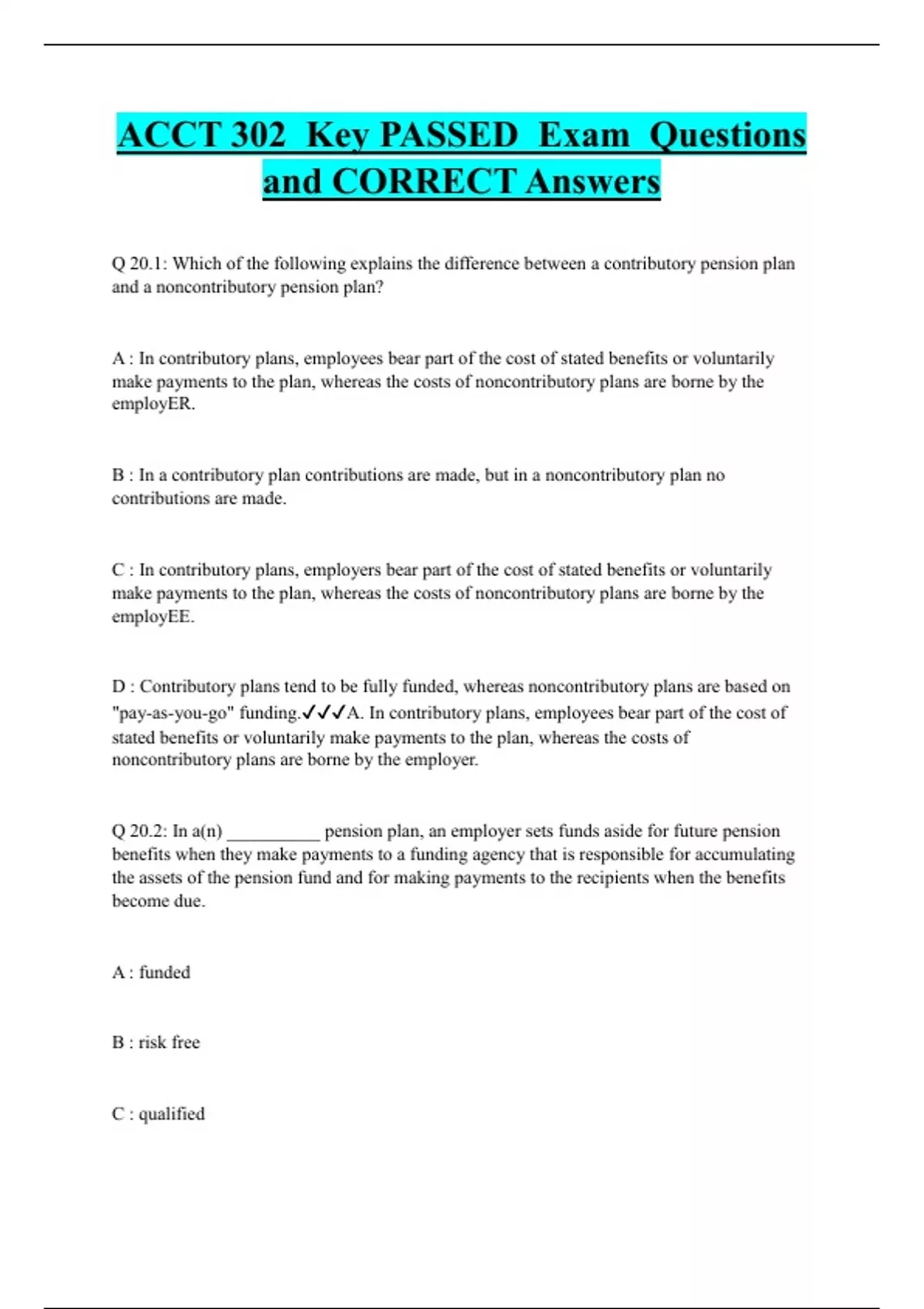 Q 20.1: Which of the following explains the difference between a contributory pension plan and a noncontributory pension plan? A : In contributory plans, employees bear part of the cost of stated benefits or voluntarily make payments to the plan, whereas the costs of noncontributory plans are borne by the employER. B : In a contributory plan contributions are made, but in a noncontributory plan no contributions are made. C : In contributory plans, employers bear part of the cost of stated benefits or voluntarily make payments to the plan, whereas the costs of noncontributory plans are borne by the employEE. D : Contributory plans tend to be fully funded, whereas noncontributory plans are based on "pay-as-you-go" funding.A. In contributory plans, employees bear part of the cost of stated benefits or voluntarily make payments to the plan, whereas the costs of noncontributory plans are borne by the employer