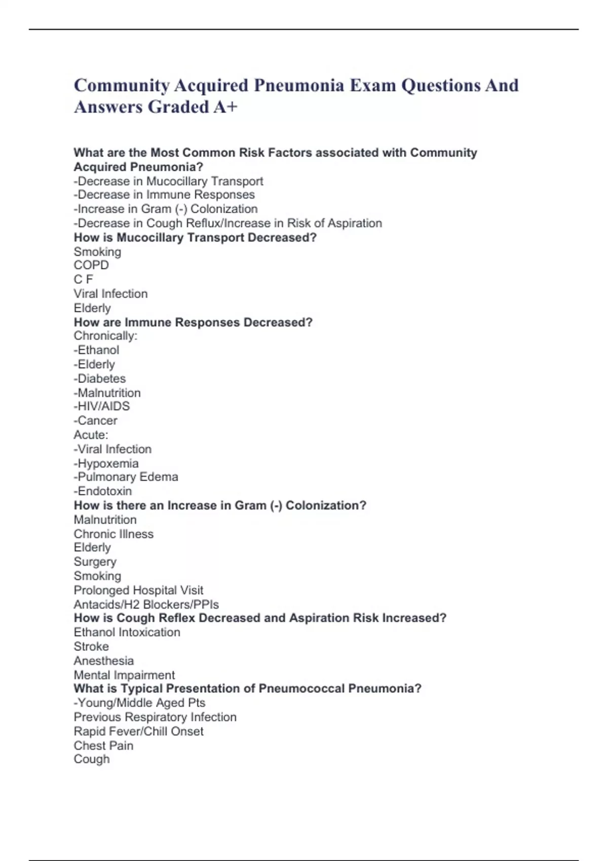 Community Acquired Pneumonia Exam Questions And Answers Graded A+ What are the Most Common Risk Factors associated with Community Acquired Pneumonia? -Decrease in Mucocillary Transport -Decrease in Immune Responses -Increase in Gram (-) Colonization -Decrease in Cough Reflux/Increase in Risk of Aspiration How is Mucocillary Transport Decreased? Smoking COPD C F Viral Infection Elderly How are Immune Responses Decreased? Chronically: -Ethanol -Elderly -Diabetes -Malnutrition -HIV/AIDS -Cancer Acute: -Viral Infection -Hypoxemia -Pulmonary Edema -Endotoxin How is there an Increase in Gram (-) Colonization? Malnutrition Chronic Illness Elderly Surgery Smoking Prolonged Hospital Visit Antacids/H2 Blockers/PPIs How is Cough Reflex Decreased and Aspiration Risk Increased? Ethanol Intoxication Stroke Anesthesia Mental Impairment What is Typical Presentation of Pneumococcal Pneumonia? -Young/Middle Aged Pts Previous Respiratory Infection Rapid Fever/Chill Onset Chest Pain