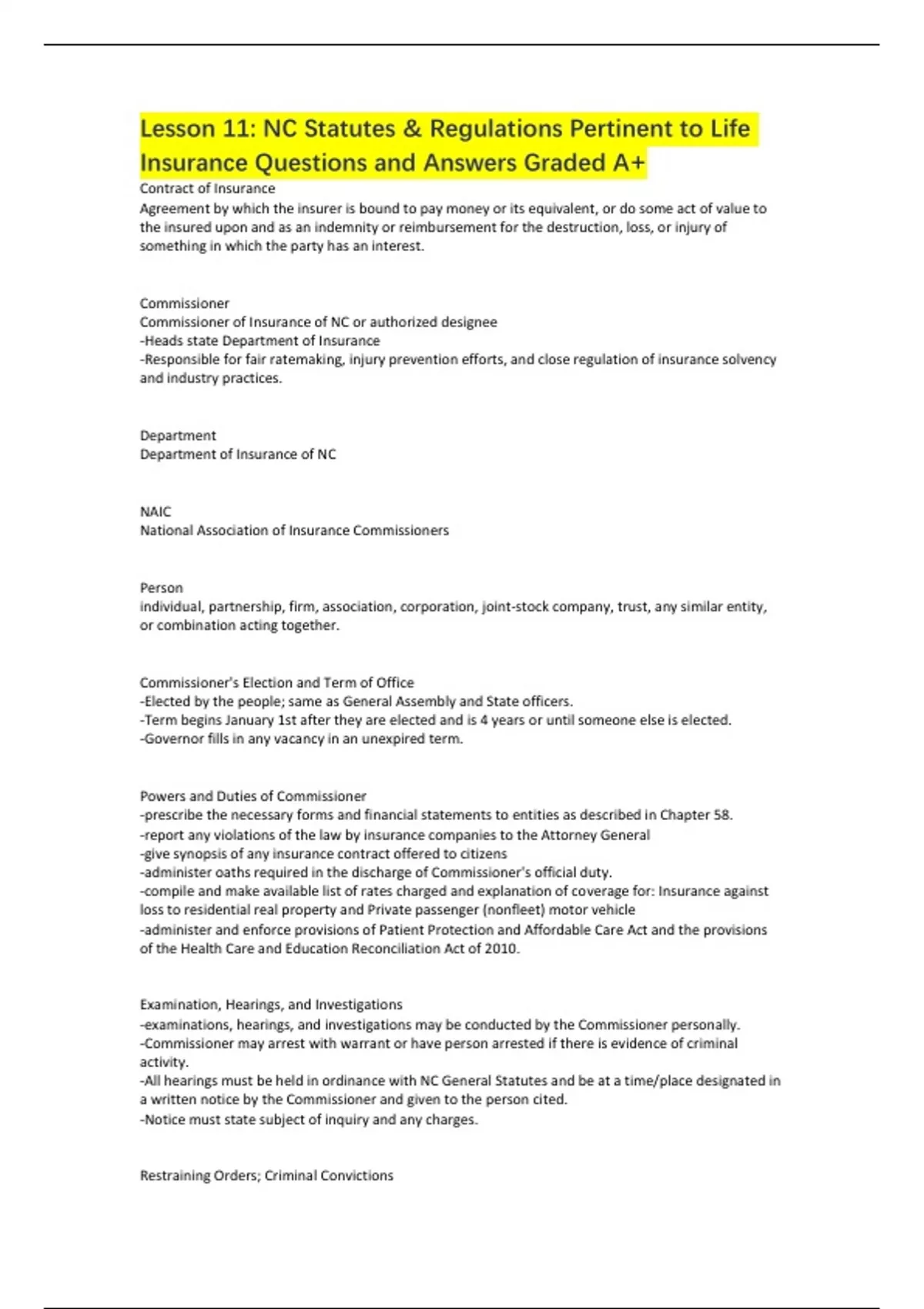 Lesson 11: NC Statutes & Regulations Pertinent to Life Insurance Questions and Answers Graded A+ Contract of Insurance Agreement by which the insurer is bound to pay money or its equivalent, or do some act of value to the insured upon and as an indemnity or reimbursement for the destruction, loss, or injury of something in which the party has an interest. Commissioner Commissioner of Insurance of NC or authorized designee -Heads state Department of Insurance -Responsible for fair ratemaking, injury prevention efforts, and close regulation of insurance solvency and industry practices. Department Department of Insurance of NC NAIC National Association of Insurance Commissioners Person individual, partnership, firm, association, corporation, joint-stock company, trust, any similar entity, or combination acting together. Commissioner's Election and Term of Office -Elected by the people; same as General Assembly and State officers. -Term begins January 1st after they are elected and is 4 years or until someone else is elected. -Governor fills in any vacancy in an unexpired term. Powers and Duties of Commissioner -prescribe the necessary forms and financial statements to entities as described in Chapter 58. -report any violations of the law by insurance companies to the Attorney General -give synopsis of any insurance contract offered to citizens -administer oaths required in the discharge of Commissioner's official duty. -compile and make available list of rates charged and explanation of coverage for: Insurance against loss to residential real property and Private passenger (nonfleet) motor vehicle -administer and enforce provisions of Patient Protection and Affordable Care Act and the provisions of the Health Care and Education Reconciliation Act of 2010. Examination, Hearings, and Investigations -examinations, hearings, and investigations may be conducted by the Commissioner personally. -Commissioner may arrest with warrant or have person arrested if there is evidence of criminal activity. -All hearings must be held in ordinance with NC General Statutes and be at a time/place designated in a written notice by the Commissioner and given to the person cited. -Notice must state subject of inquiry and any charges. Restraining Orders; Criminal Convictions -Restraining orders are given when any person violates or threatens to violate Chapter 58, or Article A of Chapter 143 of the General Statutes. -Application must be given in the superior court of any county. -When licensee is convicted in court, their license is suspended until reinstated by the Commissioner. -Conviction: adjudication of guilt, plea of guilt, and plea of nolo contendere. License Surrender -Licensee accused of any act, omission, or misconduct that would subject to suspension or revocation may surrender license for a period of time established by Commissioner. Notification of Criminal Convictions; Change of Address; Service of Notice; Contracts for Online Service, Admin Services, or Regulatory Data Systems -Applicants provide Commissioner with address and email address; has 10 business days to inform Commissioner of any changes or is subject to a $50 fee. -Any conviction other than traffic violation must be reported to Commissioner within 10 business days. -Commissioner will contact licensee directly or send first-class mail for any service notices. -Licensees needing to notify Commissioner may do so in writing or with approved online service. -Commissioner may work with NAIC to get an online service for licensees. Civil Penalties or Restitution Violations; Administrative Procedure After notice to licensee and opportunity for hearing the person may have to pay: -fine of $100-$1000 ordered by Commissioner based on degree and extent of harm. -restitution to any person harmed -restitution to any state agency to cover administrative fees. Investigation of Charges Commissioner must investigate any complaint of violations of Chapter 58. -If complaint is justified, the company is subject to penalties described in Chapter 58 as well as paying expenses for the investigation. -If company does not pay, Commissioner is authorized to bring a civil action to the company for collection of those expenses. Reporting and Investigation of Insurance and Reinsurance Fraud and the Financial Condition of Licensees; Immunity from Liability Any person participating in an investigation is not subject to civil liability for libel or slander when furnishing information to the Commissioner pertaining to: any known/suspected fraudulent ins./reins. claim, transaction, or act OR the financial condition of any licensee. Persons must release any information requested and must cooperate in investigation. False Statement to Produce or Deny Benefit of Insurance Policy or Certificate Class H felony to knowingly present (or assist someone in presenting) false or misleading information as part of a claim for payment or other insurance benefit. -Each claim counted separately; if convicted and court imposes probation, defendant may pay restitution as part of probation. -Civil conviction may result in paying compensatory damages, attorney's fees, costs, and reasonable investigative costs to the plaintiff. Embezzlement by Insurance Agents, Brokers, or Administrators Any type of embezzlement activity is subject to felony charge. -Value of $100,000 or more = Class C felony -Less than $100,000 = Class H felony Report to Commissioner Anyone thought to violate NC insurance law or a licensed entity thought to be financially impaired must be reported to Commissioner with a statement of relevant facts and circumstances. Punishment for False Statement Class I felony and court imposed fine of $2,000-$10,000. Record of Business Kept by Companies and Agents; Commissioner May Inspect Record of business must include: number, date, term, amount insured, premiums, and all people who were issued a policy or certificate of renewal. Original book of business must be available to Commissione