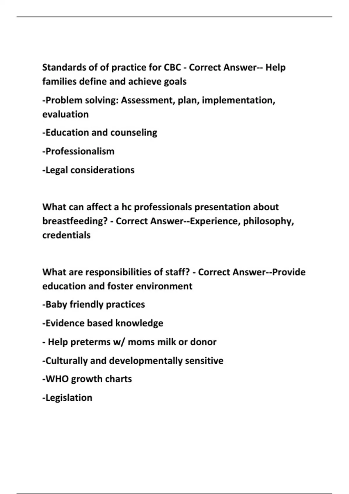 Standards of of practice for CBC - Correct Answer-- Help families define and achieve goals -Problem solving: Assessment, plan, implementation, evaluation -Education and counseling -Professionalism -Legal considerations What can affect a hc professionals presentation about breastfeeding? - Correct Answer--Experience, philosophy, credentials What are responsibilities of staff? - Correct Answer--Provide education and foster environment -Baby friendly practices -Evidence based knowledge - Help preterms w/ moms milk or donor -Culturally and developmentally sensitive -WHO growth charts -Legislation International code of marketing substitutes - Correct Answer-- No advertising -No free sample - Scientific info Not law but should be use Baby friendly 10 steps - Correct Answer--Written policy -Proper training -Proper education -Initiation w/in 1 hr -Maintain lactation even if separated -Breastmilk only unless medically required -Rooming in -Cue feeding, 8-12x -No artificial teats -Support groups Where is milk produced? - Correct Answer-Alveoli How is milk ejected into ducts from alveoli? aka let down - Correct Answer-Myoepitheal cells encase the aveoli, contract in response to oxytocin. In response to sucking oxytocin increases Different stages of breast development - Correct Answer-- embryogenesis: Mammary gland while embryo - Mammogenesis: @ puberty, estrogen influences growth of ducts and buds -Lactogensesis 1: Fullness and tenderness while pregnant. Ducts stimulated. Lactogenesis 2: Secretory activation when placenta out. D/t increase of prolactin when progestrone decreases. Lactogenesis 3: Milk removal= production. Infant sucking= oxytocin= let down. How long after cessation of breast feeding does milk production stop? - Correct Answer-40 days What happens to estrogen and progesterone during pregnancy and birth? - Correct Answer-Increase during pregnancy, decreases after birth. Helps development of lobes