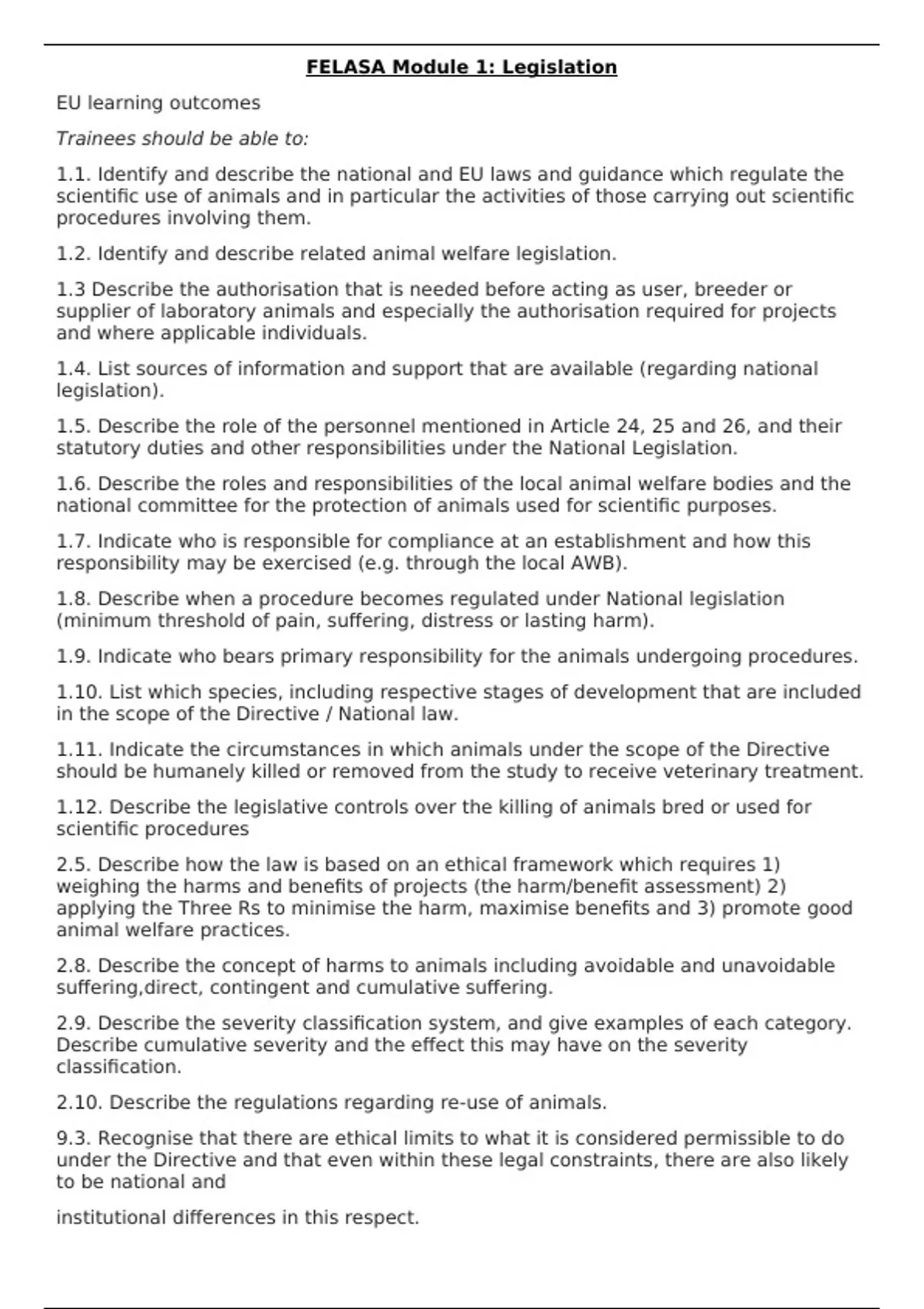 Directive 2010/63/EU and legislation/guidelines relating to: veterinary care, animal
