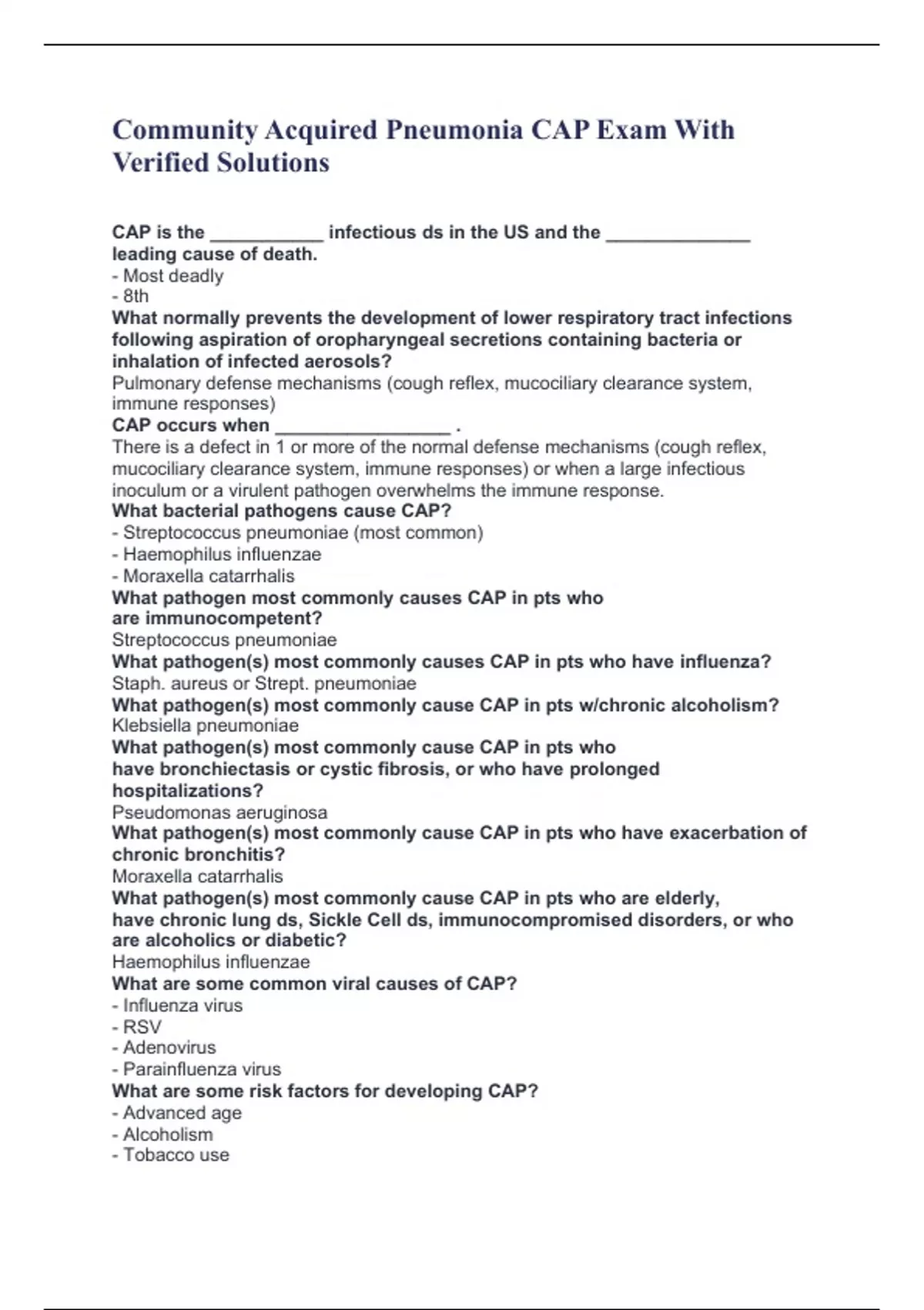 Community Acquired Pneumonia CAP Exam With Verified Solutions CAP is the ___________ infectious ds in the US and the ______________ leading cause of death. - Most deadly - 8th What normally prevents the development of lower respiratory tract infections following aspiration of oropharyngeal secretions containing bacteria or inhalation of infected aerosols? Pulmonary defense mechanisms (cough reflex, mucociliary clearance system, immune responses) CAP occurs when _________________ . There is a defect in 1 or more of the normal defense mechanisms (cough reflex, mucociliary clearance system, immune responses) or when a large infectious inoculum or a virulent pathogen overwhelms the immune response. What bacterial pathogens cause CAP? - Streptococcus pneumoniae (most common) - Haemophilus influenzae - Moraxella catarrhalis What pathogen most commonly causes CAP in pts who are immunocompetent? Streptococcus pneumoniae What pathogen(s) most commonly causes CAP in pts who have influenza? Staph. aureus or Strept. pneumoniae What pathogen(s) most commonly cause CAP in pts w/chronic alcoholism? Klebsiella pneumoniae What pathogen(s) most commonly cause CAP in pts who have bronchiectasis or cystic fibrosis, or who have prolonged hospitalizations? Pseudomonas aeruginosa What pathogen(s) most commonly cause CAP in pts who have exacerbation of chronic bronchitis? Moraxella catarrhalis What pathogen(s) most commonly cause CAP in pts who are elderly, have chronic lung ds, Sickle Cell ds, immunocompromised disorders, or who are alcoholics or diabetic? Haemophilus influenzae What are some common viral causes of CAP? - Influenza virus - RSV - Adenovirus - Parainfluenza virus What are some risk factors for developing CAP? - Advanced age - Alcoholism - Tobacco use