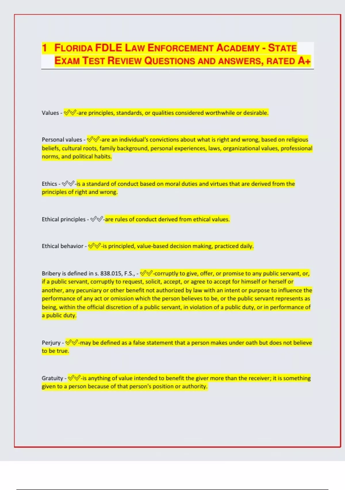 FLORIDA FDLE LAW ENFORCEMENT ACADEMY - STATE EXAM TEST REVIEW QUESTIONS AND ANSWERS, RATED A+ Values - -are principles, standards, or qualities considered worthwhile or desirable. Personal values - -are an individual's convictions about what is right and wrong, based on religious beliefs, cultural roots, family background, personal experiences, laws, organizational values, professional norms, and political habits. Ethics - -is a standard of conduct based on moral duties and virtues that are derived from the principles of right and wrong. Ethical principles - -are rules of conduct derived from ethical values. Ethical behavior - -is principled, value-based decision making, practiced daily. Bribery is defined in s. 838.015, F.S., - -corruptly to give, offer, or promise to any public servant, or, if a public servant, corruptly to request, solicit, accept, or agree to accept for himself or herself or another, any pecuniary or other benefit not authorized by law with an intent or purpose to influence the performance of any act or omission which the person believes to be, or the public servant represents as being, within the official discretion of a public servant, in violation of a public duty, or in performance of a public duty. Perjury - -may be defined as a false statement that a person makes under oath but does not believe to be true. Gratuity - -is anything of value intended to benefit the giver more than the receiver; it is something given to a person because of that person's position or authority. Professionalism - -is behavior that demonstrates good character and is marked by pride in self and career. Examples of these characteristics include service, integrity, respect, quality, fairness, honesty, courage, compassion, moral/ethical leadership, trustworthiness, and common sense. Stereotyping - -is a fixed and unvarying idea or opinion of a person, group, or subject. Bias or prejudice - -is a strong belief or feeling about a person, group, or subject, whether positive or negative, that is formed without reviewing all available facts or information. Discrimination - -is the negative behavior toward a person or group that is based on color, race, sex, age, religion, ethnic and national origin, handicap, and/or marital status. Perception - -is the impression in a person's mind of an individual, a group of people, or events based on experiences, biases, beliefs, assumptions, and observations. Sexual harassment - -is defined as unwelcome sexual advances, requests for sexual favors, and other verbal or physical conduct of a sexual nature. Quid pro quo - -"something for something in return." Hostile work environment - -an office culture where lewd jokes or other offensive habits are acceptable. Criminal justice - -refers to the structure, functions, and decision-making processes of those agencies that deal with the management and control of crime and criminal offenders. 3 main components of the Criminal Justice system - -The three main components of the criminal justice system are law enforcement, the court system, and corrections. Law enforcement - -is responsible for the enforcement of and maintaining civil order. The court system - -is responsible for the interpretation of laws. Corrections - -is responsible for enforcing punishment as defined by the court system. Four levels of law enforcement agencies within the United States: - -local or municipal, county, state, and federal Jurisdiction - -means the types of cases in which the court can make decisions. Courts of Appeal: - -these courts make decisions on appeals from lower federal courts, which are subject to review in the U.S. Supreme Court. Supreme Court of the United States: - -hears appeals from the decisions of lower federal courts and state supreme courts, and it resolves issues of constitutional and federal law. It stands as the ultimate authority in constitutional interpretation, and its decisi