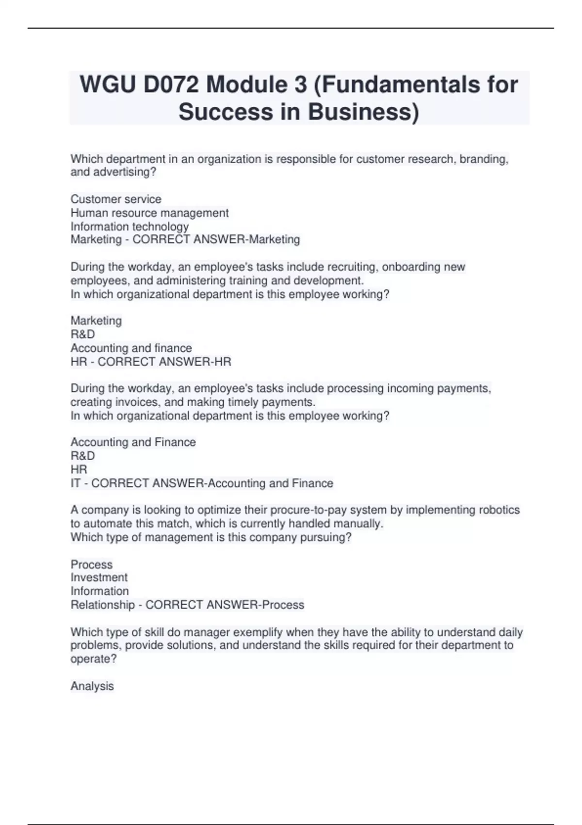 WGU D072 Module 3 (Fundamentals for Success in Business) Which department in an organization is responsible for customer research, branding, and advertising? Customer service Human resource management Information technology Marketing - CORRECT ANSWER-Marketing During the workday, an employee's tasks include recruiting, onboarding new employees, and administering training and development. In which organizational department is this employee working? Marketing R&D Accounting and finance HR - CORRECT ANSWER-HR During the workday, an employee's tasks include processing incoming payments, creating invoices, and making timely payments. In which organizational department is this employee working? Accounting and Finance R&D HR IT - CORRECT ANSWER-Accounting and Finance A company is looking to optimize their procure-to-pay system by implementing robotics to automate this match, which is currently handled manually. Which type of management is this company pursuing? Process Investment Information Relationship - CORRECT ANSWER-Process Which type of skill do manager exemplify when they have the ability to understand daily problems, provide solutions, and understand the skills required for their department to operate? Analysis Technical Communication Interpersonal - CORRECT ANSWER-Tec