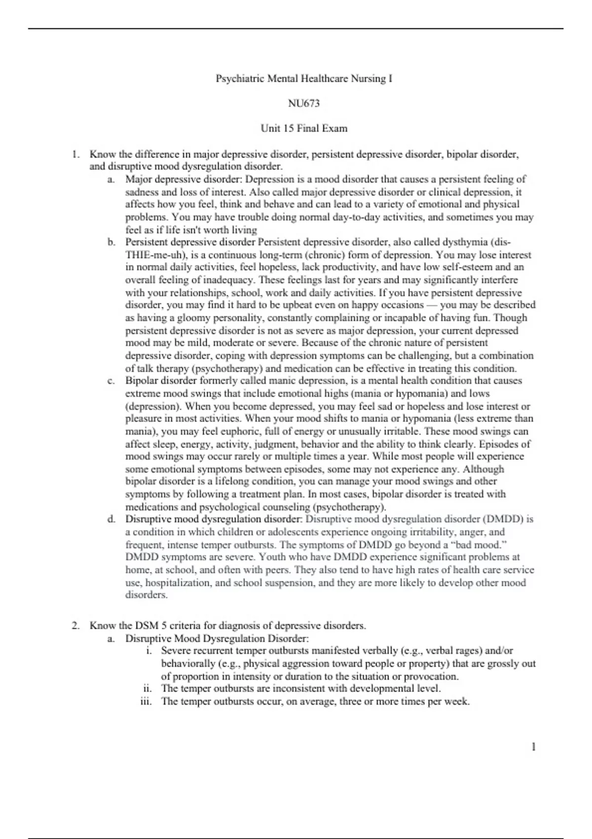 Psychiatric Mental Healthcare Nursing I NU673 Unit 15 Final Exam 1. Know the difference in major depressive disorder, persistent depressive disorder, bipolar disorder, and disruptive mood dysregulation disorder. a. Major depressive disorder: Depression is a mood disorder that causes a persistent feeling of sadness and loss of interest. Also called major depressive disorder or clinical depression, it affects how you feel, think and behave and can lead to a variety of emotional and physical problems. You may have trouble doing normal day-to-day activities, and sometimes you may feel as if life isn't worth living b. Persistent depressive disorder Persistent depressive disorder, also called dysthymia (disTHIE-me-uh), is a continuous long-term (chronic) form of depression. You may lose interest in normal daily activities, feel hopeless, lack productivity, and have low self-esteem and an overall feeling of inadequacy. These feelings last for years and may significantly interfere with your relationships, school, work and daily activities. If you have persistent depressive disorder, you may find it hard to be upbeat even on happy occasions — you may be described as having a gloomy personality, constantly complaining or incapable of having fun. Though persistent depressive disorder is not as severe as major depression, your current depressed mood may be mild, moderate or severe. Because of the chronic nature of persistent depressive disorder, coping with depression symptoms can be challenging, but a combination of talk therapy (psychotherapy) and medication can be effective in treating this condition. c. Bipolar disorder formerly called manic depression, is a mental health condition that causes extreme mood swings that include emotional highs (mania or hypomania) and lows (depression). When you become depressed, you may feel sad or hopeless and lose interest or pleasure in most activities. When your mood shifts to mania or hypomania (less extreme than mania), you may feel euphoric, full of energy or unusually irritable. These mood swings can affect sleep, energy, activity, judgment, behavior and the ability to think clearly. Episodes of mood swings may occur rarely or multiple times a year. While most people will experience some emotional symptoms between episodes, some may not experience any. Although bipolar disorder is a lifelong condition, you can manage your mood swings and other symptoms by following a treatment plan. In most cases, bipolar disorder is treated with medications and psychological counseling (psychotherapy). d. Disruptive mood dysregulation disorder: Disruptive mood dysregulation disorder (DMDD) is a condition in which children or adolescents experience ongoing irritability, anger, and frequent, intense temper outbursts. The symptoms of DMDD go beyond a “bad mood.” DMDD symptoms are severe. Youth who have DMDD experience significant problems at home, at school, and often with peers. They also tend to have high rates of health care service use, hospitalization, and school suspension, and they are more likely to develop other mood disorders. 2. Know the DSM 5 criteria for diagnosis of depressive disorders. a. Disruptive Mood Dysregulation Disorder: i. Severe recurrent temper outbursts manifested verbally (e.g., verbal rages) and/or behaviorally (e.g., physical aggression toward people or property) that are grossly out of proportion in intensity or duration to the situation or provocation. ii. The temper outbursts are inconsistent with developmental level. iii. The temper outb