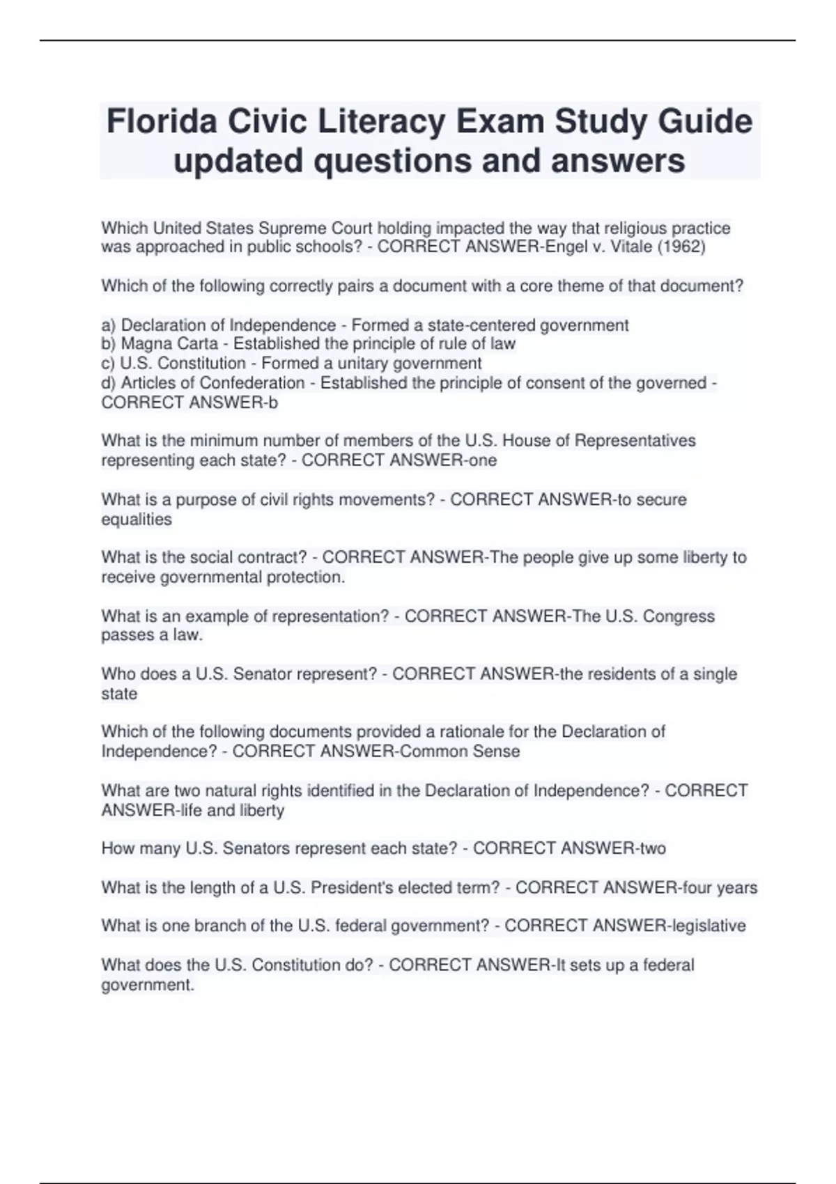 Florida Civic Literacy Exam Study Guide updated questions and answers Which United States Supreme Court holding impacted the way that religious practice was approached in public schools? - CORRECT ANSWER-Engel v. Vitale (1962) Which of the following correctly pairs a document with a core theme of that document? a) Declaration of Independence - Formed a state-centered government b) Magna Carta - Established the principle of rule of law c) U.S. Constitution - Formed a unitary government d) Articles of Confederation - Established the principle of consent of the governed - CORRECT ANSWER-b What is the minimum number of members of the U.S. House of Representatives representing each state? - CORRECT ANSWER-one What is a purpose of civil rights movements? - CORRECT ANSWER-to secure equalities What is the social contract? - CORRECT ANSWER-The people give up some liberty to receive governmental protection. What is an example of representation? - CORRECT ANSWER-The U.S. Congress passes a law. Who does a U.S. Senator represent? - CORRECT ANSWER-the residents of a single state Which of the following documents provided a rationale for the Declaration of Independence? - CORRECT ANSWER-Common Sense What are two natural rights identified in the Declaration of Independence? - CORRECT ANSWER-life and liberty How many U.S. Senators represent each state? - CORRECT ANSWER-two What is the length of a U.S. President's elected term? - CORRECT ANSWER-four years What is one branch of the U.S. federal government? - CORRECT ANSWER-legislative What does th