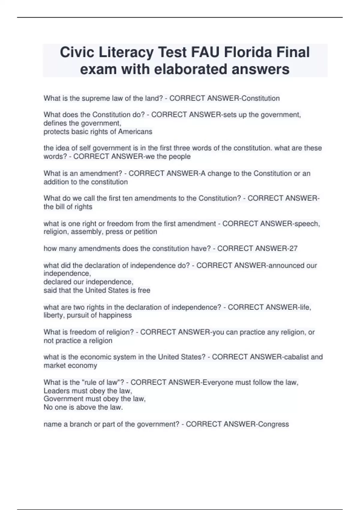 Civic Literacy Test FAU Florida Final exam with elaborated answers What is the supreme law of the land? - CORRECT ANSWER-Constitution What does the Constitution do? - CORRECT ANSWER-sets up the government, defines the government, protects basic rights of Americans the idea of self government is in the first three words of the constitution. what are these words? - CORRECT ANSWER-we the people What is an amendment? - CORRECT ANSWER-A change to the Constitution or an addition to the constitution What do we call the first ten amendments to the Constitution? - CORRECT ANSWERthe bill of rights what is one right or freedom from the first amendment - CORRECT ANSWER-speech, religion, assembly, press or petition how many amendments does the constitution have? - CORRECT ANSWER-27 what did the declaration of independence do? - CORRECT ANSWER-announced our independence, declared our independence, said that the United States is free what are two rights in the declaration of independence? - CORRECT ANSWER-life, liberty, pursuit of happiness What is freedom of religion? - CORRECT ANSWER-you can practice any religion, or not practice a religion what is the economic system in the United States? - CORRECT ANSWER-cabalist and market economy What is the "rule of law"? - CORRECT ANSWER-Everyone must follow the law, Leaders must obey the law, Government must obey the law, No one is above the law. name a branch or part of the government? - CORRECT ANSWER-Congress legislative President executive the courts judicial What stops one branch of government from bec