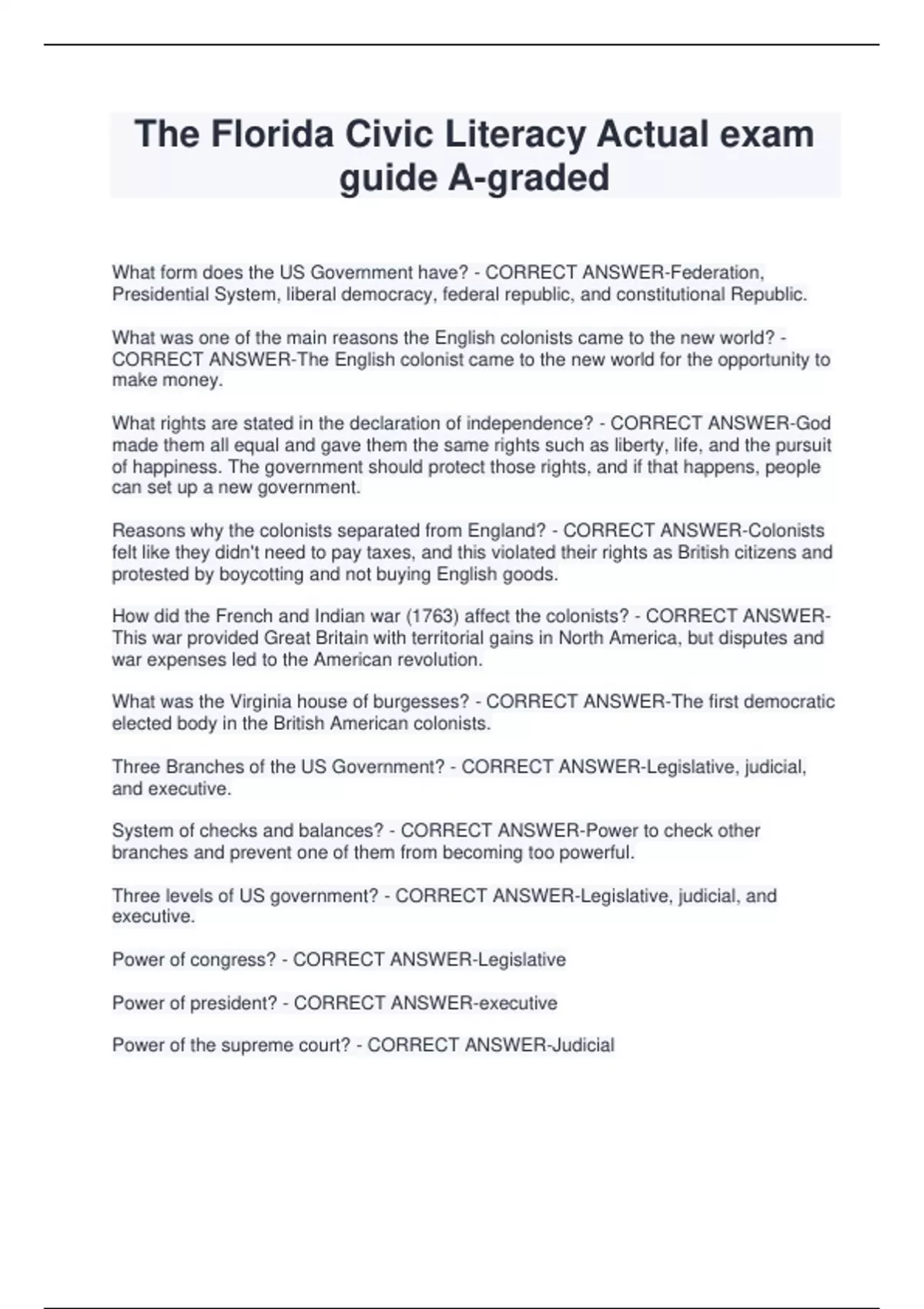 The Florida Civic Literacy Actual exam guide A-graded What form does the US Government have? - CORRECT ANSWER-Federation, Presidential System, liberal democracy, federal republic, and constitutional Republic. What was one of the main reasons the English colonists came to the new world? - CORRECT ANSWER-The English colonist came to the new world for the opportunity to make money. What rights are stated in the declaration of independence? - CORRECT ANSWER-God made them all equal and gave them the same rights such as liberty, life, and the pursuit of happiness. The government should protect those rights, and if that happens, people can set up a new government. Reasons why the colonists separated from England? - CORRECT ANSWER-Colonists felt like they didn't need to pay taxes, and this violated their rights as British citizens and protested by boycotting and not buying English goods. How did the French and Indian war (1763) affect the colonists? - CORRECT ANSWERThis war provided Great Britain with territorial gains in North America, but disputes and war expenses led to the American revolution. What was the Virginia house of burgesses? - CORRECT ANSWER-The first democratic elected body in the British American colonists. Three Branches of the US Government? - CORRECT ANSWER-Legislative, judicial, and executive. System of checks and balances? - CORRECT ANSWER-Power to check other branches and prevent one of them from becoming too powerful. Three levels of US government? - CORRECT ANSWER-Legislative, judicial, and executive. Power of congress? - CORRECT ANSWER-Legislative Power of president? - CORRECT ANSWER-executive Power of the supreme court? - CORRECT ANSWER-Judicia
