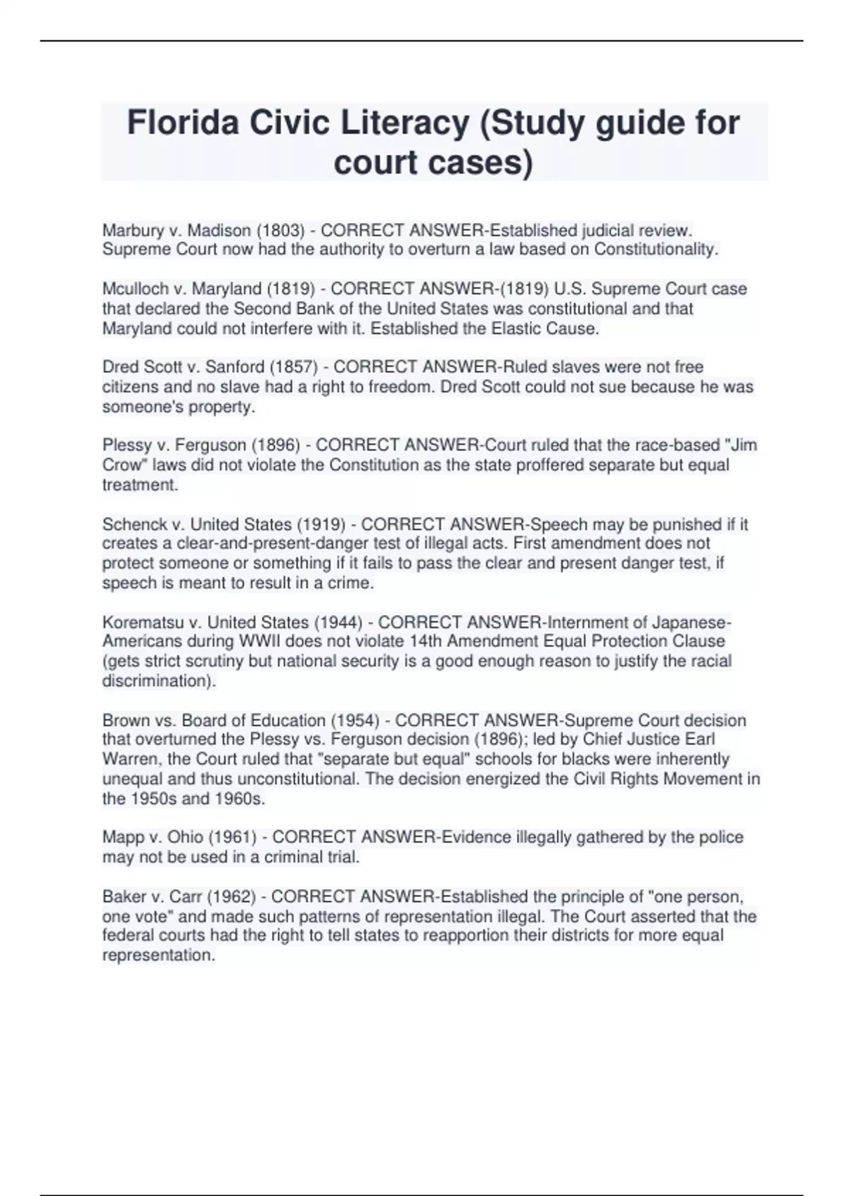 Florida Civic Literacy (Study guide for court cases) Marbury v. Madison (1803) - CORRECT ANSWER-Established judicial review. Supreme Court now had the authority to overturn a law based on Constitutionality. Mculloch v. Maryland (1819) - CORRECT ANSWER-(1819) U.S. Supreme Court case that declared the Second Bank of the United States was constitutional and that Maryland could not interfere with it. Established the Elastic Cause. Dred Scott v. Sanford (1857) - CORRECT ANSWER-Ruled slaves were not free citizens and no slave had a right to freedom. Dred Scott could not sue because he was someone's property. Plessy v. Ferguson (1896) - CORRECT ANSWER-Court ruled that the race-based "Jim Crow" laws did not violate the Constitution as the state proffered separate but equal treatment. Schenck v. United States (1919) - CORRECT ANSWER-Speech may be punished if it creates a clear-and-present-danger test of illegal acts. First amendment does not protect someone or something if it fails to pass the clear and present danger test, if speech is meant to result in a crime. Korematsu v. United States (1944) - CORRECT ANSWER-Internment of JapaneseAmericans during WWII does not violate 14th Amendment Equal Protection Clause (gets strict scrutiny but national security is a good enough reason to justify the racial discrimination). Brown vs. Board of Education (1954) - CORRECT ANSWER-Supreme Court decision that overturned the Plessy vs. Ferguson decision (1896); led by Chief Justice Earl Warren, the Court ruled that "separate but equal" schools for blacks were inherently unequal and thus unconstitutional. The decision energized the Civil Rights Movement in the 1950s and 1960s. Mapp v. Ohio (1961) - CORRECT ANSWER-Evidence illegally gathered by the police may not be used in a criminal trial. Baker v. Carr (1962) - CORRECT ANSWER-Established the principle of "one person, one vote" and made such patterns of representation illegal. The Court asserted that the federal courts had the right to tell states t