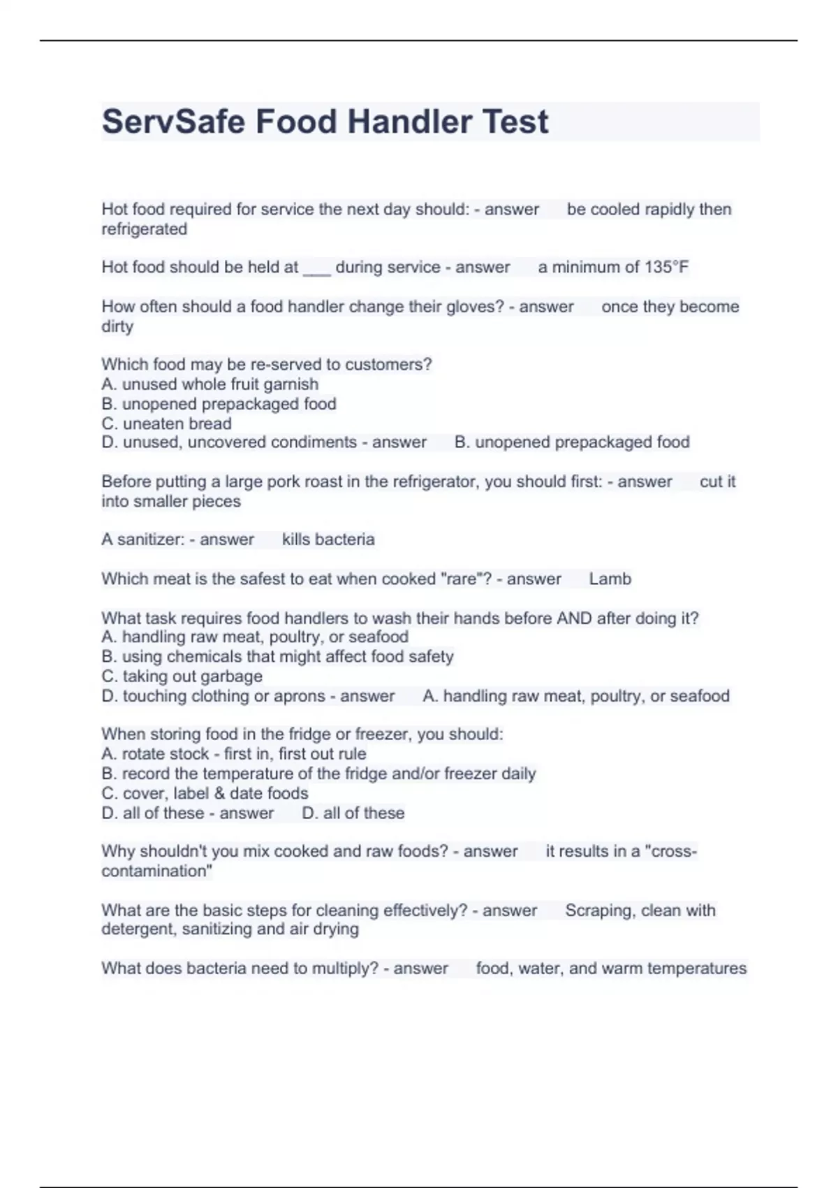 ServSafe Food Handler Test Questions with correct Answers 2024