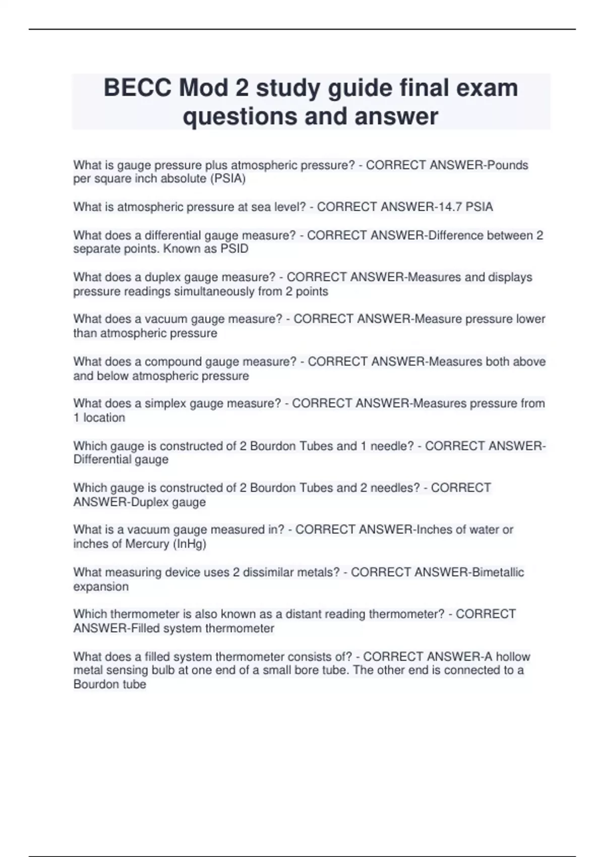 BECC Mod 2 study guide final exam questions and answer What is gauge pressure plus atmospheric pressure? - CORRECT ANSWER-Pounds per square inch absolute (PSIA) What is atmospheric pressure at sea level? - CORRECT ANSWER-14.7 PSIA What does a differential gauge measure? - CORRECT ANSWER-Difference between 2 separate points. Known as PSID What does a duplex gauge measure? - CORRECT ANSWER-Measures and displays pressure readings simultaneously from 2 points What does a vacuum gauge measure? - CORRECT ANSWER-Measure pressure lower than atmospheric pressure What does a compound gauge measure? - CORRECT ANSWER-Measures both above and below atmospheric pressure What does a simplex gauge measure? - CORRECT ANSWER-Measures pressure from 1 location Which gauge is constructed of 2 Bourdon Tubes and 1 needle? - CORRECT ANSWERDifferential gauge Which gauge is constructed of 2 Bourdon Tubes and 2 needles? - CORRECT ANSWER-Duplex gauge What is a vacuum gauge measured in? - CORRECT ANSWER-Inches of water or inches of Mercury (InHg) What measuring device uses 2 dissimilar metals? - CORRECT ANSWER-Bimetallic expansion Which thermometer is also known as a distant reading thermometer? - CORRECT ANSWER-Filled system thermometer What does a filled system thermometer consists of? - CORRECT ANSWER-A hollow metal sensing bulb at one end of a small bore tube. The other end is connected to a Bourdon tube