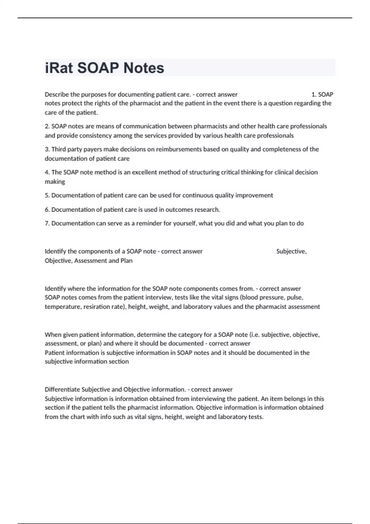 Describe the purposes for documenting patient care. - correct answer 1. SOAP notes protect the rights of the pharmacist and the patient in the event there is a question regarding the care of the patient. 2. SOAP notes are means of communication between pharmacists and other health care professionals and provide consistency among the services provided by various health care professionals 3. Third party payers make decisions on reimbursements based on quality and completeness of the documentation of patient care 4. The SOAP note method is an excellent method of structuring critical thinking for clinical decision making 5. Documentation of patient care can be used for continuous quality improvement 6. Documentation of patient care is used in outcomes research. 7. Documentation can serve as a reminder for yourself, what you did and what you plan to do Identify the components of a SOAP note - correct answer Subjective, Objective, Assessment and Plan Identify where the information for the SOAP note components comes from. - correct answer SOAP notes comes from the patient interview, tests like the vital signs (blood pressure, pulse, temperature, resiration rate), height, weight, and laboratory values and the pharmacist assessment When given patient information, determine the category for a SOAP note (i.e. subjective, objective, assessment, or plan) and where it should be documented - correct answer Patient information is subjective information in SOAP notes and it should be documented in the subjective information section Differentiate Subjective and Objective information. - correct answer Subjective information is information obtained from interviewing the patient. An item belongs in this section if the patient tells the pharmacist information. Objective information is information obtained from the chart with info such as vital signs, height, weight and laboratory tests. Recognize how subjective and objective sections of the SOAP note provide the support for the development of the Assessment and Plan sections. - correct answer .. Identify the key elements of the Assessment and Plan. - correct answer Assessment should have current status of the disease, diagnosis or problems of a patient (in order of most significant to lease significant) Plan is based on subjective, objective information and the assessment. For every problem listed in the Assessment section, there should be an item in the Plan section. The plan items should be in the same order as the problems listed in the Assessment section. Describe the guidelines for documenting patient care. - correct answer 1. Accuracy 2. Brevity 3. Clarity 4. Punctuation 5. Correcting Errors 6. Signing Your Notes Apply guidelines for documenting patient care to identify errors in SOAP notes and provide recommendations for improving the documentation of patient care. - correct answer ...