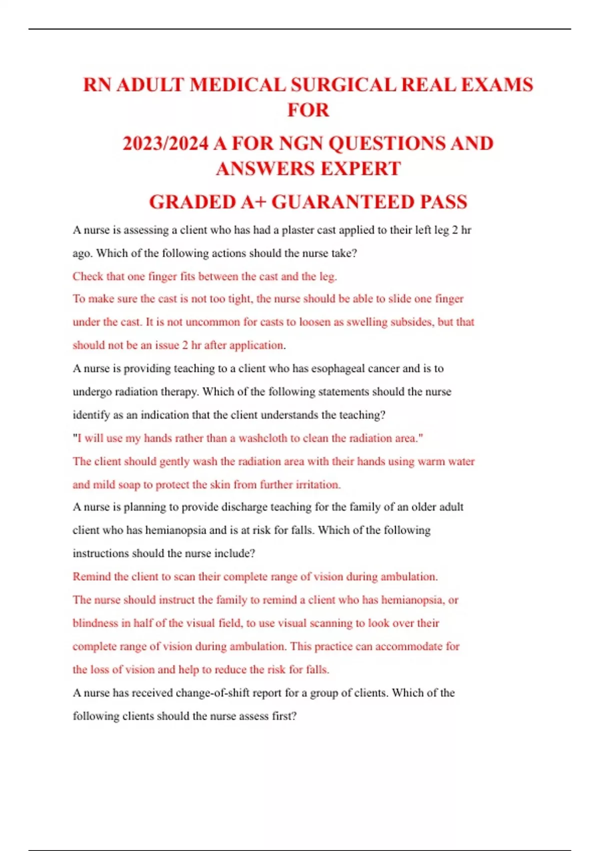 RN ADULT MEDICAL SURGICAL REAL EXAMS FOR 2023/2024 A FOR NGN QUESTIONS AND ANSWERS EXPERT GRADED A+ GUARANTEED PASS