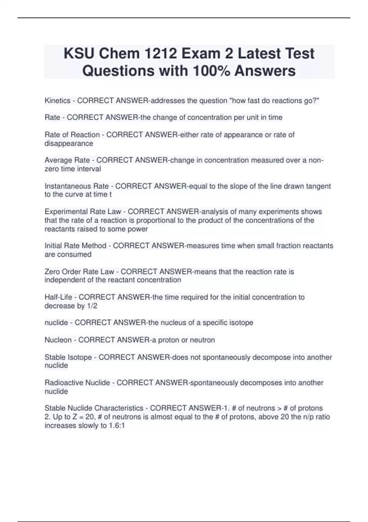 KSU Chem 1212 Exam 2 Latest Test Questions with 100% Answers Kinetics - CORRECT ANSWER-addresses the question "how fast do reactions go?" Rate - CORRECT ANSWER-the change of concentration per unit in time Rate of Reaction - CORRECT ANSWER-either rate of appearance or rate of disappearance Average Rate - CORRECT ANSWER-change in concentration measured over a nonzero time interval Instantaneous Rate - CORRECT ANSWER-equal to the slope of the line drawn tangent to the curve at time t Experimental Rate Law - CORRECT ANSWER-analysis of many experiments shows that the rate of a reaction is proportional to the product of the concentrations of the reactants raised to some power Initial Rate Method - CORRECT ANSWER-measures time when small fraction reactants are consumed