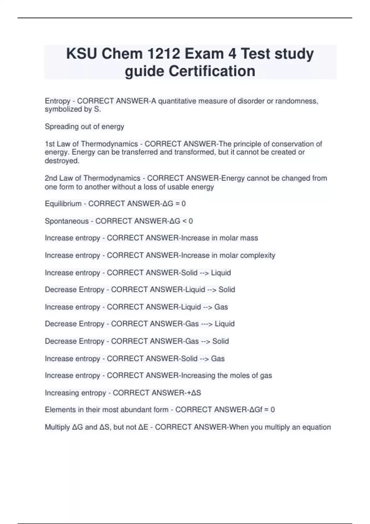 KSU Chem 1212 Exam 4 Test study guide Certification Entropy - CORRECT ANSWER-A quantitative measure of disorder or randomness, symbolized by S. Spreading out of energy 1st Law of Thermodynamics - CORRECT ANSWER-The principle of conservation of energy. Energy can be transferred and transformed, but it cannot be created or destroyed. 2nd Law of Thermodynamics - CORRECT ANSWER-Energy cannot be changed from one form to another without a loss of usable energy Equilibrium - CORRECT ANSWER-ΔG = 0 Spontaneous - CORRECT ANSWER-ΔG < 0 Increase entropy - CORRECT ANSWER-Increase in molar mass Increase entropy - CORRECT ANSWER-Increase in molar complexity Increase entropy - CORRECT ANSWER-Solid --> Liquid Decrease Entropy - CORRECT ANSWER-Liquid --> Solid Increase entropy - CORRECT ANSWER-Liquid --> Gas Decrease Entropy - CORRECT ANSWER-Gas ---> Liquid Decrease Entropy - CORRECT ANSWER-Gas --> Solid Increase entropy - CORRECT ANSWER-Solid --> Gas Increase entropy - CORRECT ANSWER-Increasing the moles of gas Increasing entropy - CORRECT ANSWER-+ΔS Elements in their most abundant form - CORRECT ANSWER-ΔGf = 0 Multiply ΔG and ΔS, but not ΔE - CORRECT ANSWER-When you multiply an equation