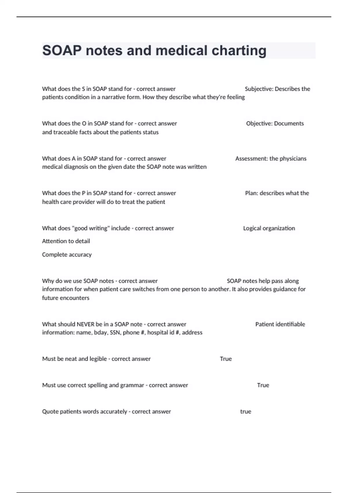 What does the S in SOAP stand for - correct answer Subjective: Describes the patients condition in a narrative form. How they describe what they're feeling What does the O in SOAP stand for - correct answer Objective: Documents and traceable facts about the patients status What does A in SOAP stand for - correct answer Assessment: the physicians medical diagnosis on the given date the SOAP note was written What does the P in SOAP stand for - correct answer Plan: describes what the health care provider will do to treat the patient What does "good writing" include - correct answer Logical organization Attention to detail Complete accuracy Why do we use SOAP notes - correct answer SOAP notes help pass along information for when patient care switches from one person to another. It also provides guidance for future encounters What should NEVER be in a SOAP note - correct answer Patient identifiable information: name, bday, SSN, phone #, hospital id #, address Must be neat and legible - correct answer True Must use correct spelling and grammar - correct answer True Quote patients words accurately - correct answer true Don't sign name and title - correct answer false Use objective observations - correct answer true Should you scribble out errors - correct answer No, cross it out with a single line, write error next to it, along with your initials Should you make up results - correct answer No Should you leave spaces blank - correct answer No Can you chart for someone else - correct answer No Patient Charts are... - correct answer property of the health facility Do not erase or obliterate on a chart - correct answer true Need written patient consent to... - correct answer release information All entries should be written in - correct answer blue or black ink (allergies in red) The identification sheet is also known as the - correct answer Face sheet Charts may include - correct answer H+P Physicians orders Nurses note Graphic chart Medication records Progress notes Reports and forms Labs Consults