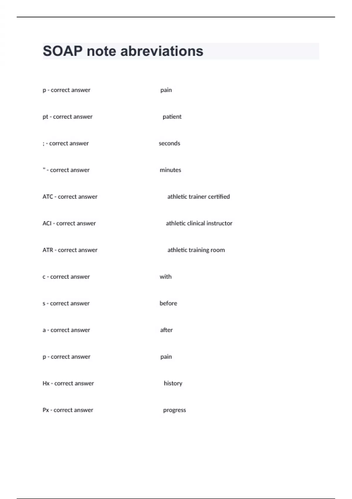 S.O.A.P note - correct answer Subjective Objective Assessment Plan Subjective - correct answer -This section is reported by the patient. -It is important to specify who is providing the information (patient, guardian, a nurse, etc.) -Pediatric patients must always have an adult present to speak on their behalf. -You must also consider if the source of information is reliable. If the person giving the history seems unsure of important details, they should be recorded as a poor historian. Subjective Chief Complaint - correct answer -A quick description of why the patient is being seen. -This can be a few words (i.e. chest pain) or a sentence (i.e. "Ben is a 45 yo male who presents with chest pain") Subjective History of Present Illness (HPI) - correct answer -Provides a clear thought process of the clinician. -It adds detail about the patient's visit and gives background including associated risk factors and pertinent personal and family history. -The HPI should be exceedingly clear and concise while still being thorough. Subjective History of Present Illness (HPI) - Intro - correct answer -The first sentence of an HPI should allow the reader to understand who the patient is and why they are being seen. -Start with name, age, and gender of the patient as well as their chief complaint for a solid foundation. -"Bruce is a 21 yo male presenting with abdominal pain." -Then add any relevant details such as past medical conditions, family history, or risk factors. -"Bruce i a 21 yo male with a history of hypertension, presenting in the office with abdominal pain. Subjective HPI body - correct answer -The next few sentences should explain more about the current condition. -A good tool to use in order to add extra details is the acronym OPPQRST. -Onset: this section described how the symptoms began, what the patient was doing at the time, and if it was sudden or gradual. -Provocative: what made it worse? -Palliative: what made it better? -Quality: description of the symptoms (dull, sharp, achy, cramping) -Radiation: location of the symptom, whether it's diffuse or localized, and if the symptom travels anywhere else in the body. -Severity: usually quantifies the pain on a scale of 1-10, with 10 being the worst pain the patient has ever experienced. -Timing: how frequently does the symptom occur? -Timing of the ___ section should start from the beginning and work towards the present. -Consider if there were any hospitalizations, surgeries, diagnostic tests and results. -Following the history is the pertinent positives and negatives. -The provider may ask questions regarding associated symptoms with the condition. -In the example about Bruce's abdominal pain, the provider may also ask about fever, nausea, or vomiting. Subjective History of Present Illness (HPI) - Ending - correct answer -The natural flow of the history transitions with the provider's thought process. -The direction of the note will address other systems as they attempt to formulate a differential diagnosis. -In the example about Bruce's abdominal pain, the provider may begin to address cardiovascular symptoms as well. -It is to group information together as best as possible as each series of questions are meant to eliminate certain possibilities the patient may be diagnosed with. Subjective History of Present Illness (HPI) Extra details - correct answer -Use proper medical terminology as much as possible. -Keep in mind working environments may be chaotic and recording all these details may be difficult as certain details may not be addressed or may be answered out of order from what you are intending to write. -This may require you to readdress this information with the patient or the provider. -Each provider also has their own style so you may find yourself adapting to their preferences. -These preferences may include specific details to records, usage of certain pronouns (like using "the patient" instead of "he/she"), and key phrases, terms, or abbreviations. -Fragments are ok if done properly. For example, "No recent hospitalizations or surgeries. No previous medical history." HPI Verbiage - Admits - correct answer -When asked a question by the provider, patient responds with affirmation (i.e. patient admits to coughing) HPI Verbiage - Denies - correct answer -When asked a question by the provider, patient responds with a negative (i.e. patient denies any chest pain) HPI Verbiage - Describes - correct answer -Usually used when patient is describing pain or qualitative properties (i.e. she describes the pain as dull) HPI Verbiage - Endorses - correct answer -To support, when a patient answers a question with affirmation (i.e. patient endorses having a dry cough) HPI Verbiage - Gestures - correct answer -When a patient uses hand gestures to point out a body region (i.e. patient gestures towards pain in her left thigh region) HPI Verbiage - Reports - correct answer -Used when a patient makes a statement about their history, can be interchanged with "states" or "notes" (i.e. patient reports he has been experiencing chest pains) Subjective Review of Systems (ROS) - correct answer -This section covers all the systems of the body from general/constitutional to genitourinary. -The information provided in the HPI should be addressed in the ROS as well. -For example, if the