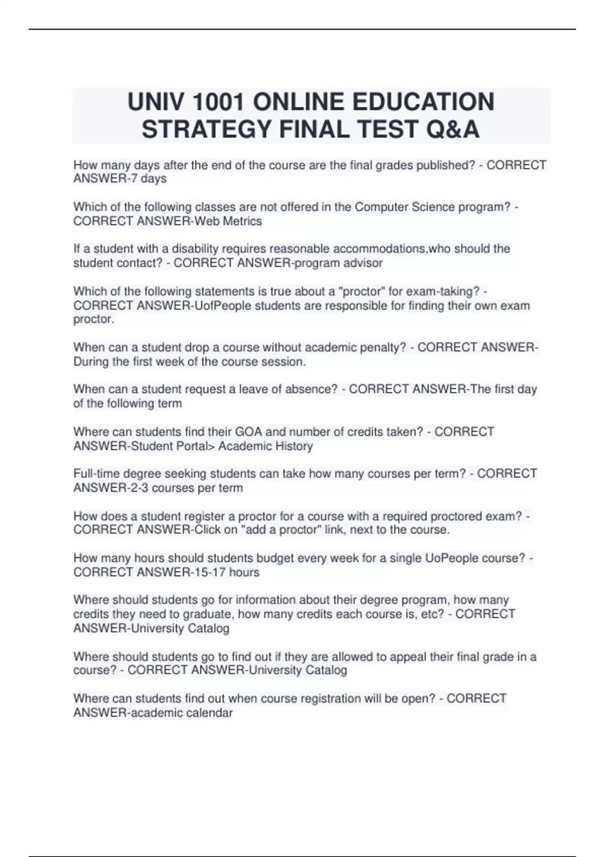 UNIV 1001 ONLINE EDUCATION STRATEGY FINAL TEST Q&A How many days after the end of the course are the final grades published? - CORRECT ANSWER-7 days Which of the following classes are not offered in the Computer Science program? - CORRECT ANSWER-Web Metrics If a student with a disability requires reasonable accommodations,who should the student contact? - CORRECT ANSWER-program advisor Which of the following statements is true about a "proctor" for exam-taking? - CORRECT ANSWER-UofPeople students are responsible for finding their own exam proctor. When can a student drop a course without academic penalty? - CORRECT ANSWERDuring the first week of the course session. When can a student request a leave of absence? - CORRECT ANSWER-The first day of the following term Where can students find their GOA and number of credits taken? - CORRECT ANSWER-Student Portal> Academic History Full-time degree seeking students can take how many courses per term? - CORRECT ANSWER-2-3 courses per term How does a student register a proctor for a course with a required proctored exam? - CORRECT ANSWER-Click on "add a proctor" link, next to the course. How many hours should students budget every week for a single UoPeople course? - CORRECT ANSWER-15-17 hours Where should students go for information about their degree program, how many credits they need to graduate, how many credits each course is, etc? - CORRECT ANSWER-University Catalog Where should students go to find out if they are allowed to appeal their final grade in a course? - CORRECT ANSWER-University Catalog Where can students find out when course registration will be open? - CORRECT ANSWER-academic calendar