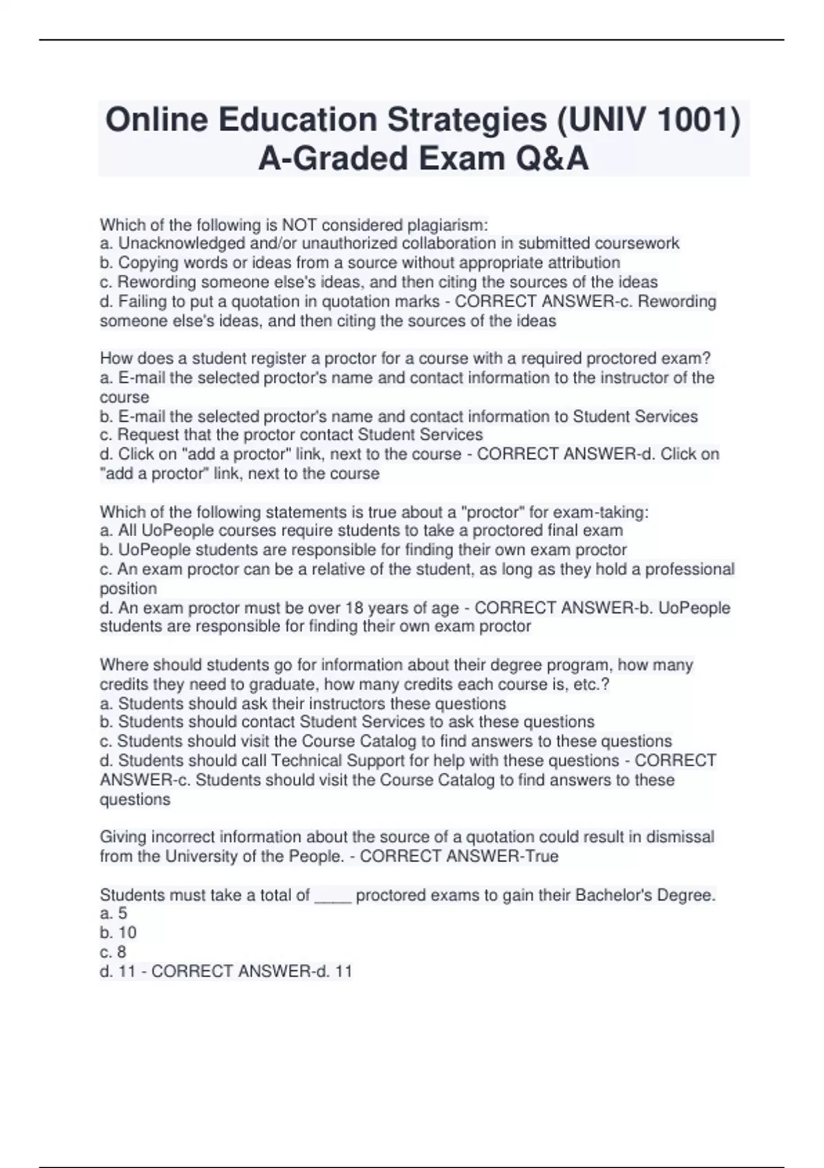 Online Education Strategies (UNIV 1001) A-Graded Exam Q&A Which of the following is NOT considered plagiarism: a. Unacknowledged and/or unauthorized collaboration in submitted coursework b. Copying words or ideas from a source without appropriate attribution c. Rewording someone else's ideas, and then citing the sources of the ideas d. Failing to put a quotation in quotation marks - CORRECT ANSWER-c. Rewording someone else's ideas, and then citing the sources of the ideas How does a student register a proctor for a course with a required proctored exam? a. E-mail the selected proctor's name and contact information to the instructor of the course b. E-mail the selected proctor's name and contact information to Student Services c. Request that the proctor contact Student Services d. Click on "add a proctor" link, next to the course - CORRECT ANSWER-d. Click on "add a proctor" link, next to the course Which of the following statements is true about a "proctor" for exam-taking: a. All UoPeople courses require students to take a proctored final exam b. UoPeople students are responsible for finding their own exam proctor c. An exam proctor can be a relative of the student, as long as they hold a professional position d. An exam proctor must be over 18 years of age - CORRECT ANSWER-b. UoPeople students are responsible for finding their own exam proctor Where should students go for information about their degree program, how many credits they need to graduate, how many credits each course is, etc.? a. Students should ask their instructors these questions b. Students should contact Student Services to ask these questions c. Students should visit the Course Catalog to find answers to these questions d. Students should call Technical Support for help with these questions - CORRECT ANSWER-c. Students should visit the Course Catalog to find answers to these questions Giving incorrect information about the source of a quotation could result in dismissal from the University of the People. - CORRECT ANSWER-True Students must take a total of ____ proctored exams to gain their Bachelor's Degree. a. 5 b. 10 c. 8 d. 11 - CORRECT ANSWER-d. 11 Successful discussion forums require that students clearly understand the question(s) presented and are able to suggest interesting solutions and/or additional problems. - CORRECT ANSWER-True Peer and self-assessments help a student to develop the ability to make judgments. - CORRECT ANSWER-True Bloom's Taxonomy of Learning can be thought of as "goals of the learning process." - CORRECT ANSWER-True