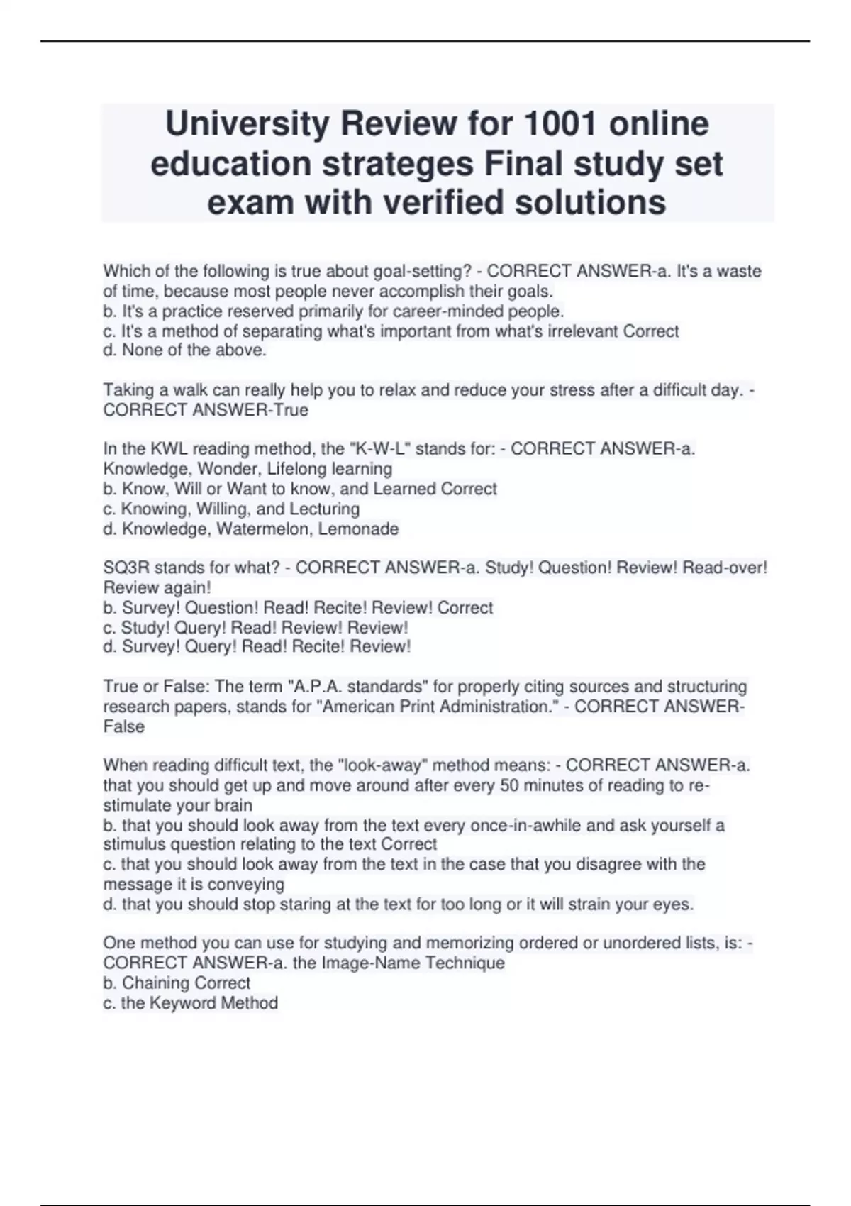 University Review for 1001 online education strateges Final study set exam with verified solutions Which of the following is true about goal-setting? - CORRECT ANSWER-a. It's a waste of time, because most people never accomplish their goals. b. It's a practice reserved primarily for career-minded people. c. It's a method of separating what's important from what's irrelevant Correct d. None of the above. Taking a walk can really help you to relax and reduce your stress after a difficult day. - CORRECT ANSWER-True In the KWL reading method, the "K-W-L" stands for: - CORRECT ANSWER-a. Knowledge, Wonder, Lifelong learning b. Know, Will or Want to know, and Learned Correct c. Knowing, Willing, and Lecturing d. Knowledge, Watermelon, Lemonade SQ3R stands for what? - CORRECT ANSWER-a. Study! Question! Review! Read-over! Review again! b. Survey! Question! Read! Recite! Review! Correct c. Study! Query! Read! Review! Review! d. Survey! Query! Read! Recite! Review! True or False: The term "A.P.A. standards" for properly citing sources and structuring research papers, stands for "American Print Administration." - CORRECT ANSWERFalse When reading difficult text, the "look-away" method means: - CORRECT ANSWER-a. that you should get up and move around after every 50 minutes of reading to restimulate your brain b. that you should look away from the text every once-in-awhile and ask yourself a stimulus question relating to the text Correct c. that you should look away from the text in the case that you disagree with the message it is conveying d. that you should stop staring at the text for too long or it will strain your eyes. One method you can use for studying and memorizing ordered or unordered lists, is: - CORRECT ANSWER-a. the Image-Name Technique b. Chaining Correct c. the Keyword Method