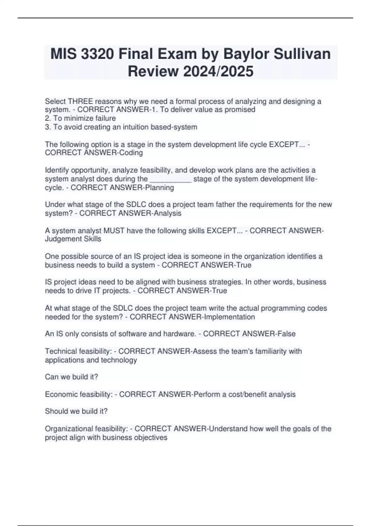 MIS 3320 Final Exam by Baylor Sullivan Review 2024/2025 Select THREE reasons why we need a formal process of analyzing and designing a system. - CORRECT ANSWER-1. To deliver value as promised 2. To minimize failure 3. To avoid creating an intuition based-system The following option is a stage in the system development life cycle EXCEPT... - CORRECT ANSWER-Coding Identify opportunity, analyze feasibility, and develop work plans are the activities a system analyst does during the __________ stage of the system development lifecycle. - CORRECT ANSWER-Planning Under what stage of the SDLC does a project team father the requirements for the new system? - CORRECT ANSWER-Analysis A system analyst MUST have the following skills EXCEPT... - CORRECT ANSWERJudgement Skills One possible source of an IS project idea is someone in the organization identifies a business needs to build a system - CORRECT ANSWER-True IS project ideas need to be aligned with business strategies. In other words, business needs to drive IT projects. - CORRECT ANSWER-True At what stage of the SDLC does the project team write the actual programming codes needed for the system? - CORRECT ANSWER-Implementation An IS only consists of software and hardware. - CORRECT ANSWER-False Technical feasibility: - CORRECT ANSWER-Assess the team's familiarity with applications and technology Can we build it? Economic feasibility: - CORRECT ANSWER-Perform a cost/benefit analysis Should we build it? Organizational feasibility: - CORRECT ANSWER-Understand how well the goals of the project align with business objectives If we build it, will it be useful?
