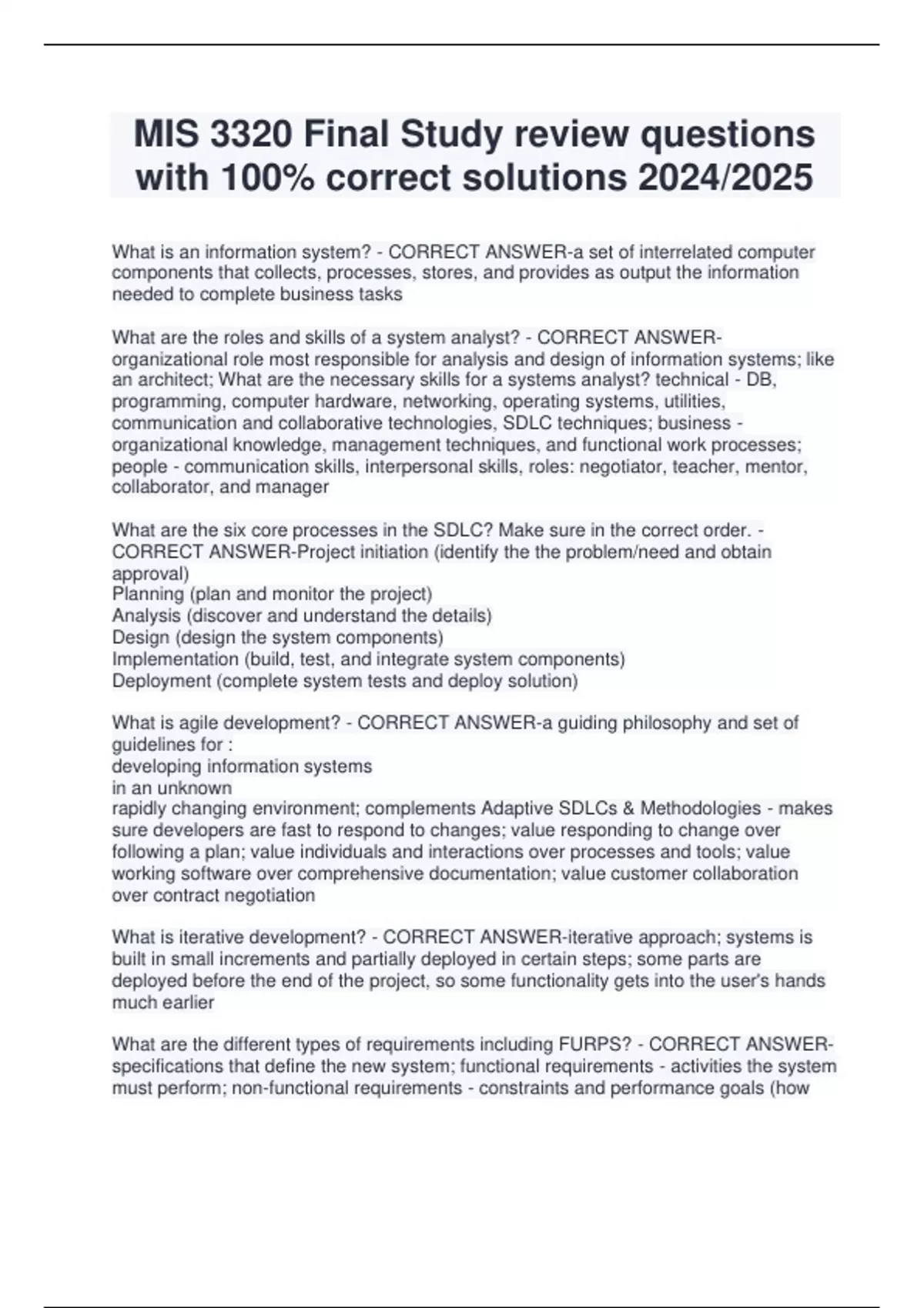 MIS 3320 Final Study review questions with 100% correct solutions 2024/2025 What is an information system? - CORRECT ANSWER-a set of interrelated computer components that collects, processes, stores, and provides as output the information needed to complete business tasks What are the roles and skills of a system analyst? - CORRECT ANSWERorganizational role most responsible for analysis and design of information systems; like an architect; What are the necessary skills for a systems analyst? technical - DB, programming, computer hardware, networking, operating systems, utilities, communication and collaborative technologies, SDLC techniques; business - organizational knowledge, management techniques, and functional work processes; people - communication skills, interpersonal skills, roles: negotiator, teacher, mentor, collaborator, and manager What are the six core processes in the SDLC? Make sure in the correct order. - CORRECT ANSWER-Project initiation (identify the the problem/need and obtain approval) Planning (plan and monitor the project) Analysis (discover and understand the details) Design (design the system components) Implementation (build, test, and integrate system components) Deployment (complete system tests and deploy solution) What is agile development? - CORRECT ANSWER-a guiding philosophy and set of guidelines for : developing information systems in an unknown rapidly changing environment; complements Adaptive SDLCs & Methodologies - makes sure developers are fast to respond to changes; value responding to change over following a plan; value individuals and interactions over processes and tools; value working software over comprehensive documentation; value customer collaboration over contract negotiation What is iterative development? - CORRECT ANSWER-iterative approach; systems is built in small increments and partially deployed in certain steps; some parts are deployed before the end of the project, so some functionality gets into the user's hands much earlier What are the different types of requirements including FURPS? - CORRECT ANSWERspecifications that define the new system; functional requirements - activities the system must perform; non-functional requirements - constraints and performance goals (how the system should behave - quality attributes for a system); FURPS [Functional requirements, usability requirements (UI design, navigation, help doc.), reliability requirements (available reqs., detection, backup, and recovery), performance requirements (response time - real time or batch), security requirements (data storage, data transmission, and encryption)]