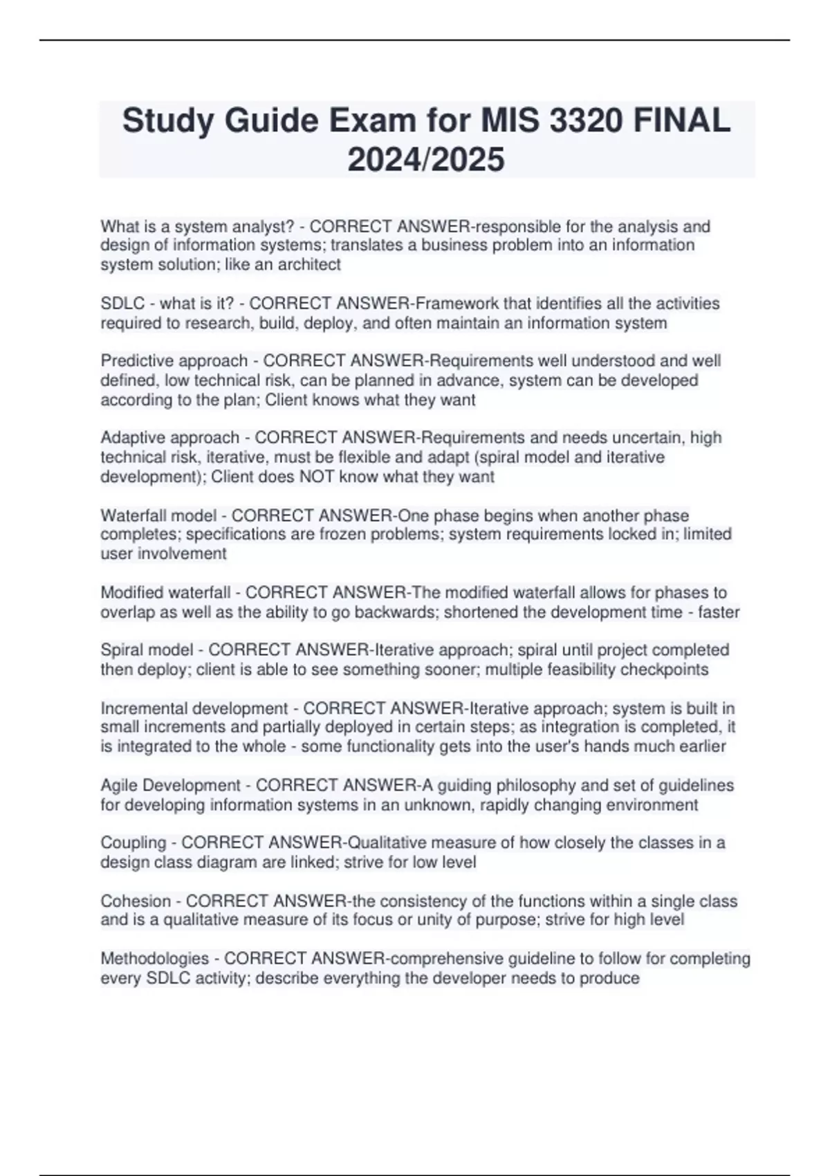 Study Guide Exam for MIS 3320 FINAL 2024/2025 What is a system analyst? - CORRECT ANSWER-responsible for the analysis and design of information systems; translates a business problem into an information system solution; like an architect SDLC - what is it? - CORRECT ANSWER-Framework that identifies all the activities required to research, build, deploy, and often maintain an information system Predictive approach - CORRECT ANSWER-Requirements well understood and well defined, low technical risk, can be planned in advance, system can be developed according to the plan; Client knows what they want Adaptive approach - CORRECT ANSWER-Requirements and needs uncertain, high technical risk, iterative, must be flexible and adapt (spiral model and iterative development); Client does NOT know what they want Waterfall model - CORRECT ANSWER-One phase begins when another phase completes; specifications are frozen problems; system requirements locked in; limited user involvement Modified waterfall - CORRECT ANSWER-The modified waterfall allows for phases to overlap as well as the ability to go backwards; shortened the development time - faster Spiral model - CORRECT ANSWER-Iterative approach; spiral until project completed then deploy; client is able to see something sooner; multiple feasibility checkpoints Incremental development - CORRECT ANSWER-Iterative approach; system is built in small increments and partially deployed in certain steps; as integration is completed, it is integrated to the whole - some functionality gets into the user's hands much earlier Agile Development - CORRECT ANSWER-A guiding philosophy and set of guidelines for developing information systems in an unknown, rapidly changing environment Coupling - CORRECT ANSWER-Qualitative measure of how closely the classes in a design class diagram are linked; strive for low level Cohesion - CORRECT ANSWER-the consistency of the functions within a single class and is a qualitative measure of its focus or unity of purpose; strive for high level Methodologies - CORRECT ANSWER-comprehensive guideline to follow for completing every SDLC activity; describe everything the developer needs to produce