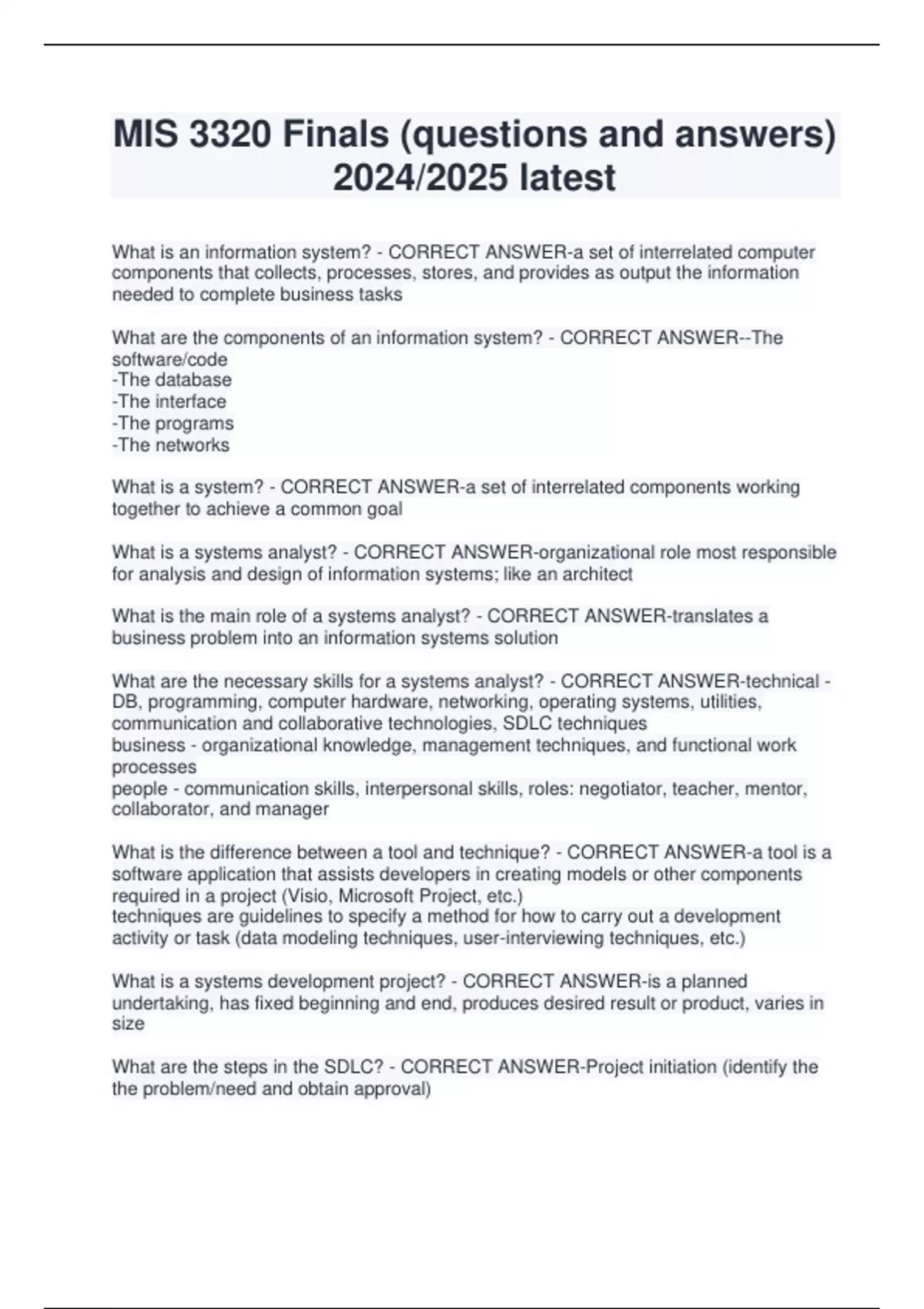 MIS 3320 Finals (questions and answers) 2024/2025 latest What is an information system? - CORRECT ANSWER-a set of interrelated computer components that collects, processes, stores, and provides as output the information needed to complete business tasks What are the components of an information system? - CORRECT ANSWER--The software/code -The database -The interface -The programs -The networks What is a system? - CORRECT ANSWER-a set of interrelated components working together to achieve a common goal What is a systems analyst? - CORRECT ANSWER-organizational role most responsible for analysis and design of information systems; like an architect What is the main role of a systems analyst? - CORRECT ANSWER-translates a business problem into an information systems solution What are the necessary skills for a systems analyst? - CORRECT ANSWER-technical - DB, programming, computer hardware, networking, operating systems, utilities, communication and collaborative technologies, SDLC techniques business - organizational knowledge, management techniques, and functional work processes people - communication skills, interpersonal skills, roles: negotiator, teacher, mentor, collaborator, and manager What is the difference between a tool and technique? - CORRECT ANSWER-a tool is a software application that assists developers in creating models or other components required in a project (Visio, Microsoft Project, etc.) techniques are guidelines to specify a method for how to carry out a development activity or task (data modeling techniques, user-interviewing techniques, etc.) What is a systems development project? - CORRECT ANSWER-is a planned undertaking, has fixed beginning and end, produces desired result or product, varies in size What are the steps in the SDLC? - CORRECT ANSWER-Project initiation (identify the the problem/need and obtain approval) Planning (plan and monitor the project)