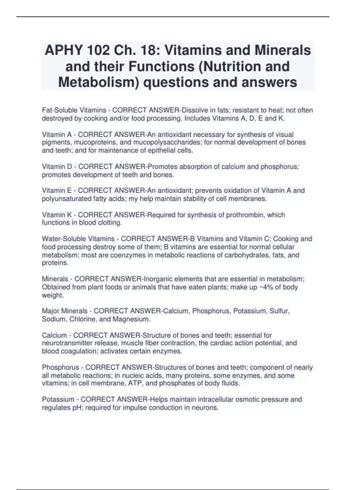APHY 102 Ch. 18: Vitamins and Minerals and their Functions (Nutrition and Metabolism) questions and answers Fat-Soluble Vitamins - CORRECT ANSWER-Dissolve in fats; resistant to heat; not often destroyed by cooking and/or food processing. Includes Vitamins A, D, E and K. Vitamin A - CORRECT ANSWER-An antioxidant necessary for synthesis of visual pigments, mucoproteins, and mucopolysaccharides; for normal development of bones and teeth; and for maintenance of epithelial cells. Vitamin D - CORRECT ANSWER-Promotes absorption of calcium and phosphorus; promotes development of teeth and bones. Vitamin E - CORRECT ANSWER-An antioxidant; prevents oxidation of Vitamin A and polyunsaturated fatty acids; my help maintain stability of cell membranes. Vitamin K - CORRECT ANSWER-Required for synthesis of prothrombin, which functions in blood clotting.