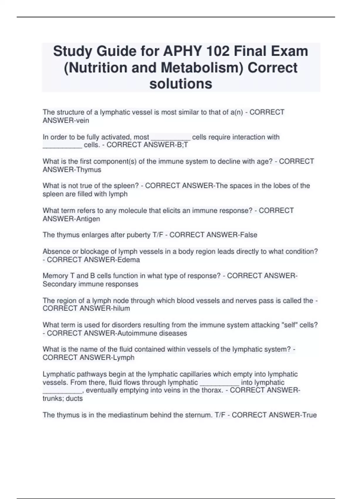 Study Guide for APHY 102 Final Exam (Nutrition and Metabolism) Correct solutions The structure of a lymphatic vessel is most similar to that of a(n) - CORRECT ANSWER-vein In order to be fully activated, most __________ cells require interaction with __________ cells. - CORRECT ANSWER-B;T What is the first component(s) of the immune system to decline with age? - CORRECT ANSWER-Thymus What is not true of the spleen? - CORRECT ANSWER-The spaces in the lobes of the spleen are filled with lymph What term refers to any molecule that elicits an immune response? - CORRECT ANSWER-Antigen The thymus enlarges after puberty T/F - CORRECT ANSWER-False Absence or blockage of lymph vessels in a body region leads directly to what condition? - CORRECT ANSWER-Edema Memory T and B cells function in what type of response? - CORRECT ANSWERSecondary immune responses The region of a lymph node through which blood vessels and nerves pass is called the - CORRECT ANSWER-hilum What term is used for disorders resulting from the immune system attacking "self" cells? - CORRECT ANSWER-Autoimmune diseases What is the name of the fluid contained within vessels of the lymphatic system? - CORRECT ANSWER-Lymph Lymphatic pathways begin at the lymphatic capillaries which empty into lymphatic vessels. From there, fluid flows through lymphatic __________ into lymphatic __________, eventually emptying into veins in the thorax. - CORRECT ANSWERtrunks; ducts The thymus is in the mediastinum behind the sternum. T/F - CORRECT ANSWER-True Lymph eventually is returned to the circulation at what blood vessels? - CORRECT ANSWER-Right and left subclavian veins