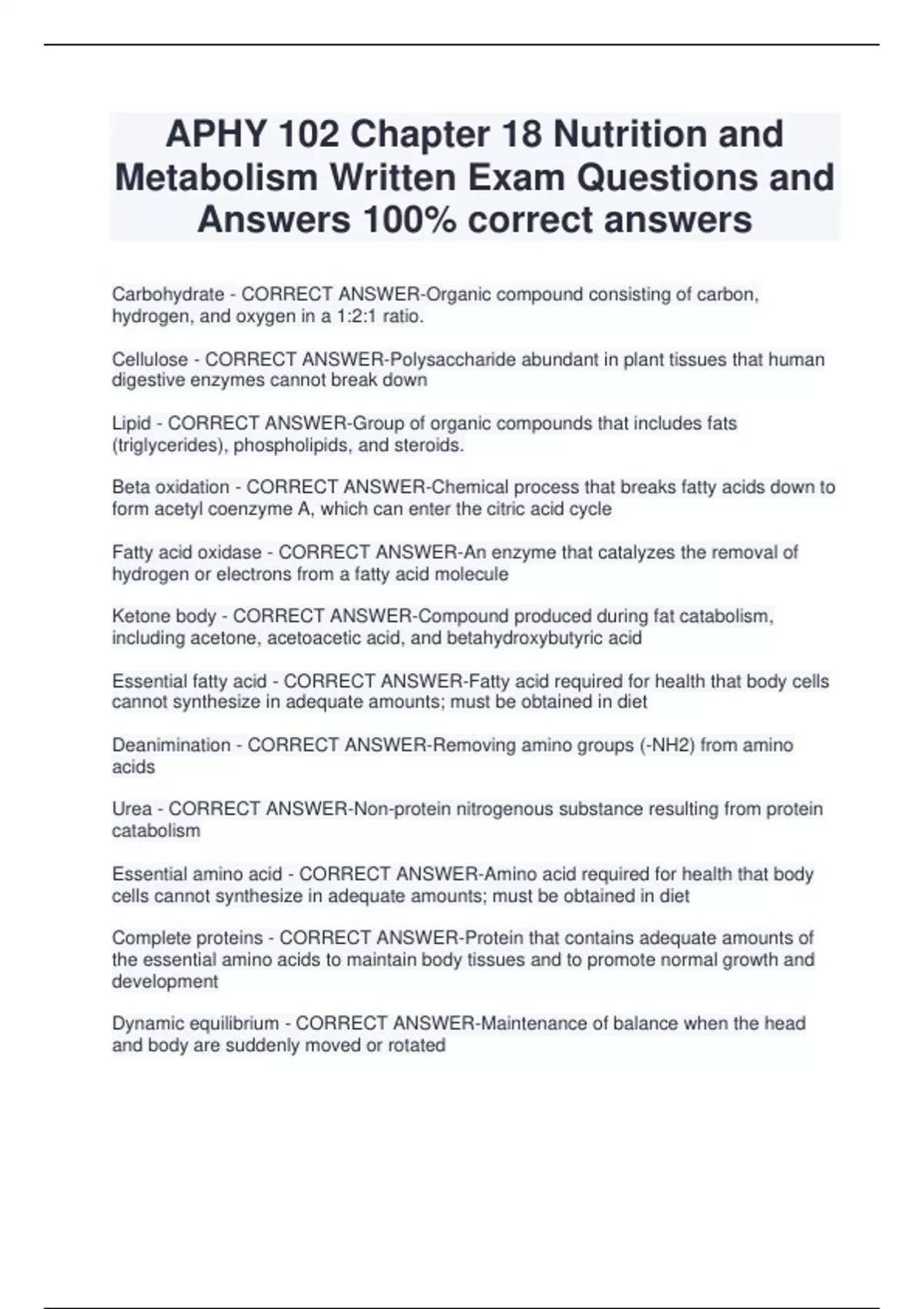 APHY 102 Chapter 18 Nutrition and Metabolism Written Exam Questions and Answers 100% correct answers Carbohydrate - CORRECT ANSWER-Organic compound consisting of carbon, hydrogen, and oxygen in a 1:2:1 ratio. Cellulose - CORRECT ANSWER-Polysaccharide abundant in plant tissues that human digestive enzymes cannot break down Lipid - CORRECT ANSWER-Group of organic compounds that includes fats (triglycerides), phospholipids, and steroids. Beta oxidation - CORRECT ANSWER-Chemical process that breaks fatty acids down to form acetyl coenzyme A, which can enter the citric acid cycle Fatty acid oxidase - CORRECT ANSWER-An enzyme that catalyzes the removal of hydrogen or electrons from a fatty acid molecule Ketone body - CORRECT ANSWER-Compound produced during fat catabolism, including acetone, acetoacetic acid, and betahydroxybutyric acid Essential fatty acid - CORRECT ANSWER-Fatty acid required for health that body cells cannot synthesize in adequate amounts; must be obtained in diet