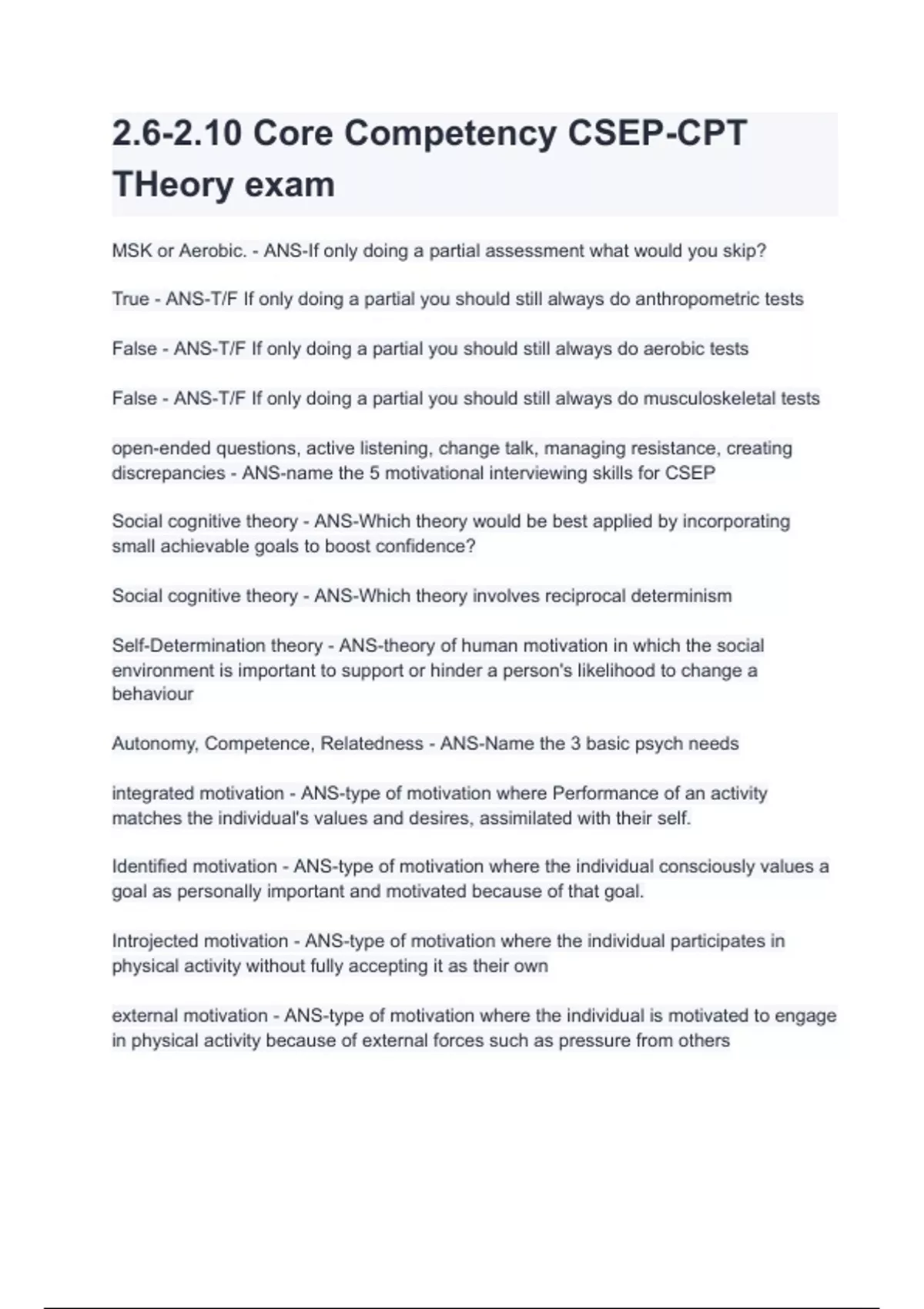 2.6-2.10 Core Competency CSEP-CPT THeory exam with complete solutions