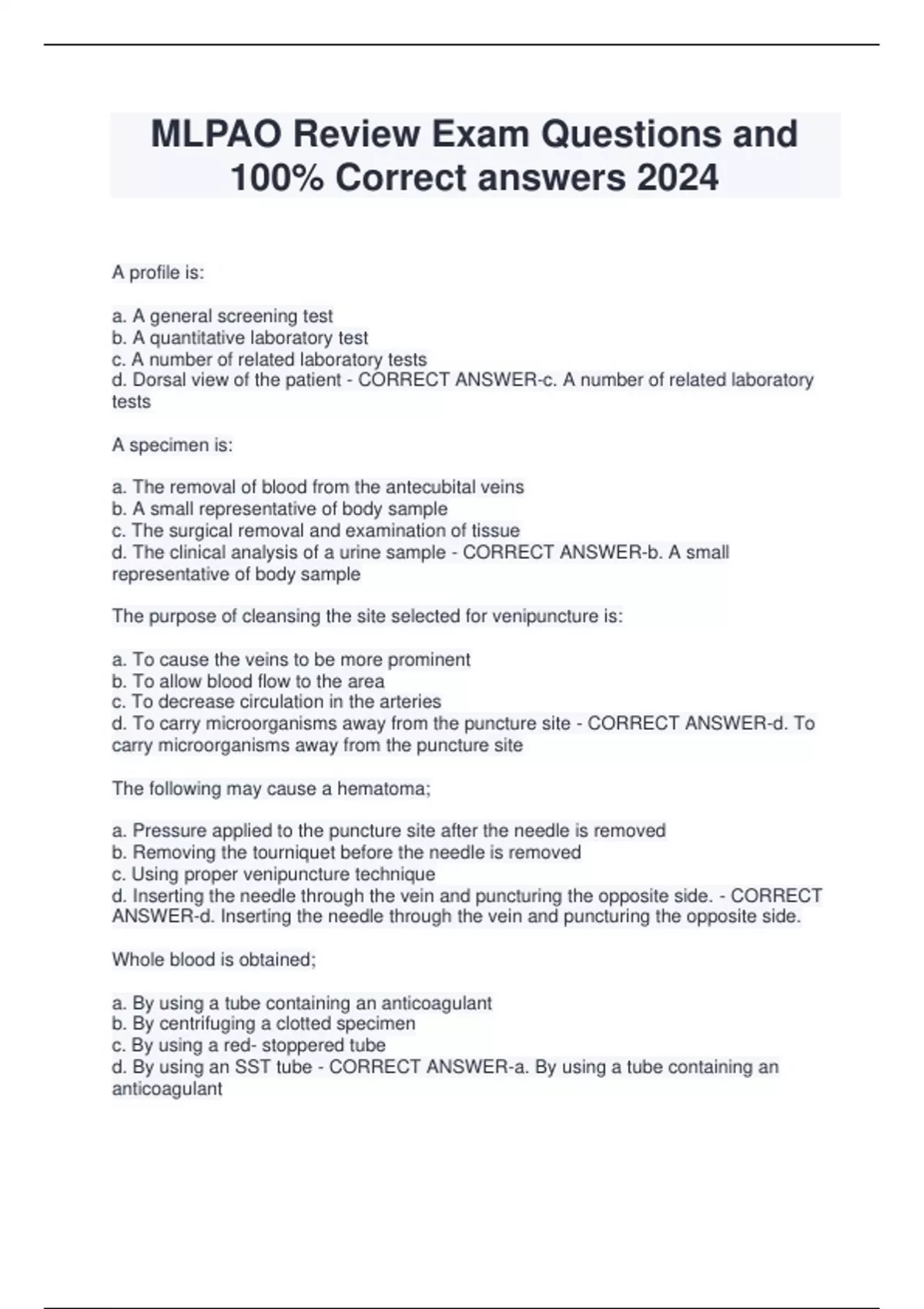 MLPAO Review Exam Questions and 100% Correct answers 2024 A profile is: a. A general screening test b. A quantitative laboratory test c. A number of related laboratory tests d. Dorsal view of the patient - CORRECT ANSWER-c. A number of related laboratory tests A specimen is: a. The removal of blood from the antecubital veins b. A small representative of body sample c. The surgical removal and examination of tissue d. The clinical analysis of a urine sample - CORRECT ANSWER-b. A small representative of body sample The purpose of cleansing the site selected for venipuncture is: a. To cause the veins to be more prominent b. To allow blood flow to the area c. To decrease circulation in the arteries d. To carry microorganisms away from the puncture site - CORRECT ANSWER-d. To carry microorganisms away from the puncture site The following may cause a hematoma; a. Pressure applied to the puncture site after the needle is removed b. Removing the tourniquet before the needle is removed c. Using proper venipuncture technique d. Inserting the needle through the vein and puncturing the opposite side. - CORRECT ANSWER-d. Inserting the needle through the vein and puncturing the opposite side. Whole blood is obtained; a. By using a tube containing an anticoagulant b. By centrifuging a clotted specimen c. By using a red- stoppered tube d. By using an SST tube - CORRECT ANSWER-a. By using a tube containing an anticoagulant Venipuncture needles should be discarded: a. Directly into the garbage b. They are actually recycled, not discarded c. Directly into an autoclave bag d. Directly into a Sharps container - CORRECT ANSWER-d. Directly into a Sharps container If a vein feels lumpy or ropey when palpated it is probably: a. Flabby b. Deep c. Tortuous d. Superficial - CORRECT ANSWER-Tortuous To convert Farenheit to Celcius: a. 5/9 (F-32) b. 9/5 + 32 (C) c. 5/9 - 32 (F) d. 9/5 (C + 32) - CORRECT ANSWER-a. 5/9 (F-32) Which term means death of the heart muscle? a. Myocardial infarction b. Angina pectoris c. Cardiomyopathy d. Myocardial angina - CORRECT ANSWER-a. Myocardial infarction Glassware used to measure 24 hour urine is a (an) a. Volumetric flask b. Beaker c. Erlenmeyer cylinder d. Graduated cylinder e. Safety bulb - CORRECT ANSWER-d. Graduated cylinder Glassware used to make 100 mls. of a 12% solution is a (an): a. Volumetric flask b. Beaker c. Erlenmeyer cylinder d. Graduated cylinder e. Safety bulb - CORRECT ANSWER-a. Volumetric flask