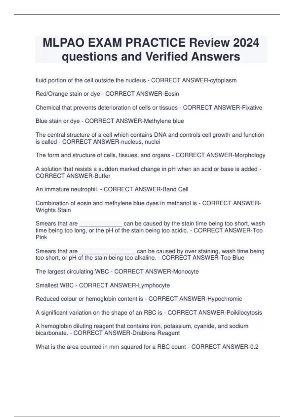 MLPAO EXAM PRACTICE Review 2024 questions and Verified Answers fluid portion of the cell outside the nucleus - CORRECT ANSWER-cytoplasm Red/Orange stain or dye - CORRECT ANSWER-Eosin Chemical that prevents deterioration of cells or tissues - CORRECT ANSWER-Fixative Blue stain or dye - CORRECT ANSWER-Methylene blue The central structure of a cell which contains DNA and controls cell growth and function is called - CORRECT ANSWER-nucleus, nuclei The form and structure of cells, tissues, and organs - CORRECT ANSWER-Morphology A solution that resists a sudden marked change in pH when an acid or base is added - CORRECT ANSWER-Buffer An immature neutrophil. - CORRECT ANSWER-Band Cell Combination of eosin and methylene blue dyes in methanol is - CORRECT ANSWERWrights Stain Smears that are _____________ can be caused by the stain time being too short, wash time being too long, or the pH of the stain being too acidic. - CORRECT ANSWER-Too Pink Smears that are _________________ can be caused by over staining, wash time being too short, or pH of the stain being too alkaline. - CORRECT ANSWER-Too Blue The largest circulating WBC - CORRECT ANSWER-Monocyte Smallest WBC - CORRECT ANSWER-Lymphocyte Reduced colour or hemoglobin content is - CORRECT ANSWER-Hypochromic A significant variation on the shape of an RBC is - CORRECT ANSWER-Poikilocytosis A hemoglobin diluting reagent that contains iron, potassium, cyanide, and sodium bicarbonate. - CORRECT ANSWER-Drabkins Reagent What is the area counted in mm squared for a RBC count - CORRECT ANSWER-0.2