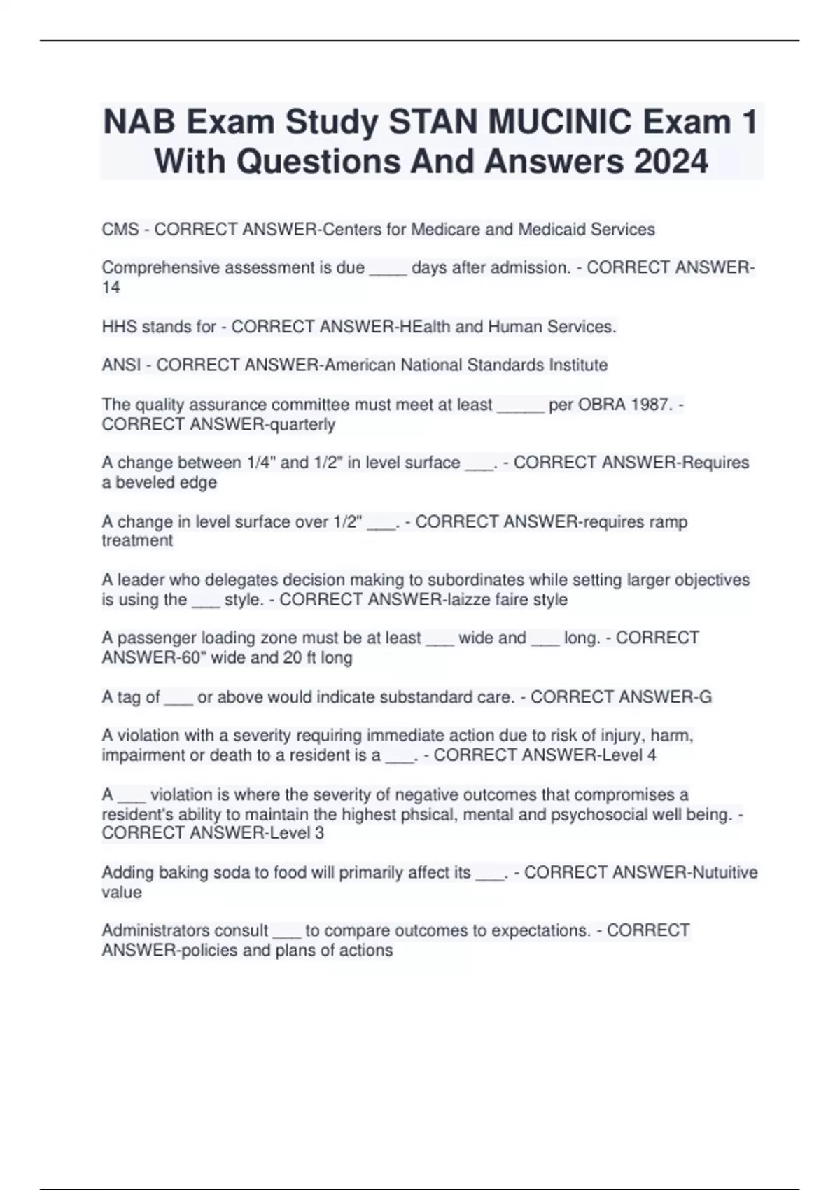 NAB Exam Study STAN MUCINIC Exam 1 With Questions And Answers 2024 CMS - CORRECT ANSWER-Centers for Medicare and Medicaid Services Comprehensive assessment is due ____ days after admission. - CORRECT ANSWER14 HHS stands for - CORRECT ANSWER-HEalth and Human Services. ANSI - CORRECT ANSWER-American National Standards Institute The quality assurance committee must meet at least _____ per OBRA 1987. - CORRECT ANSWER-quarterly A change between 1/4" and 1/2" in level surface ___. - CORRECT ANSWER-Requires a beveled edge A change in level surface over 1/2" ___. - CORRECT ANSWER-requires ramp treatment A leader who delegates decision making to subordinates while setting larger objectives is using the ___ style. - CORRECT ANSWER-laizze faire style A passenger loading zone must be at least ___ wide and ___ long. - CORRECT ANSWER-60" wide and 20 ft long A tag of ___ or above would indicate substandard care. - CORRECT ANSWER-G A violation with a severity requiring immediate action due to risk of injury, harm, impairment or death to a resident is a ___. - CORRECT ANSWER-Level 4 A ___ violation is where the severity of negative outcomes that compromises a resident's ability to maintain the highest phsical, mental and psychosocial well being. - CORRECT ANSWER-Level 3 Adding baking soda to food will primarily affect its ___. - CORRECT ANSWER-Nutuitive value Administrators consult ___ to compare outcomes to expectations. - CORRECT ANSWER-policies and plans of actions
