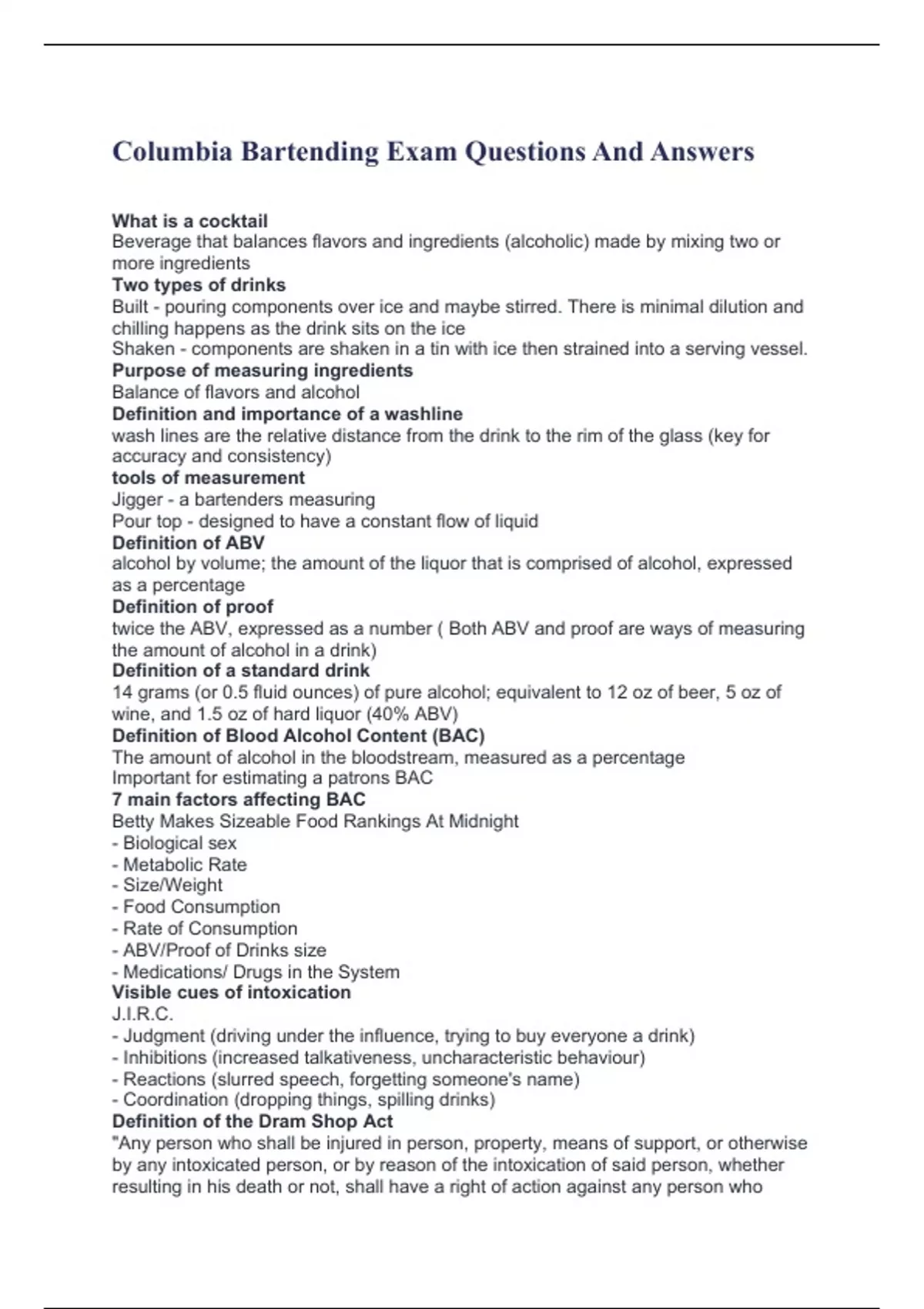 Columbia Bartending Exam Questions And Answers What is a cocktail Beverage that balances flavors and ingredients (alcoholic) made by mixing two or more ingredients Two types of drinks Built - pouring components over ice and maybe stirred. There is minimal dilution and chilling happens as the drink sits on the ice Shaken - components are shaken in a tin with ice then strained into a serving vessel. Purpose of measuring ingredients Balance of flavors and alcohol Definition and importance of a washline wash lines are the relative distance from the drink to the rim of the glass (key for accuracy and consistency) tools of measurement Jigger - a bartenders measuring Pour top - designed to have a constant flow of liquid Definition of ABV alcohol by volume; the amount of the liquor that is comprised of alcohol, expressed as a percentage Definition of proof twice the ABV, expressed as a number ( Both ABV and proof are ways of measuring the amount of alcohol in a drink) Definition of a standard drink 14 grams (or 0.5 fluid ounces) of pure alcohol; equivalent to 12 oz of beer, 5 oz of wine, and 1.5 oz of hard liquor (40% ABV) Definition of Blood Alcohol Content (BAC) The amount of alcohol in the bloodstream, measured as a percentage Important for estimating a patrons BAC 7 main factors affecting BAC Betty Makes Sizeable Food Rankings At Midnight - Biological sex - Metabolic Rate - Size/Weight - Food Consumption - Rate of Consumption - ABV/Proof of Drinks size - Medications/ Drugs in the System Visible cues of intoxication J.I.R.C. - Judgment (driving under the influence, trying to buy everyone a drink) - Inhibitions (increased talkativeness, uncharacteristic behaviour) - Reactions (slurred speech, forgetting someone's name) - Coordination (dropping things, spilling drinks) Definition of the Dram Shop Act "Any person who shall be injured in person, property, means of support, or otherwise by any intoxicated person, or by reason of the intoxication of said person, whether resulting in his death or not, shall have a right of action against any person who