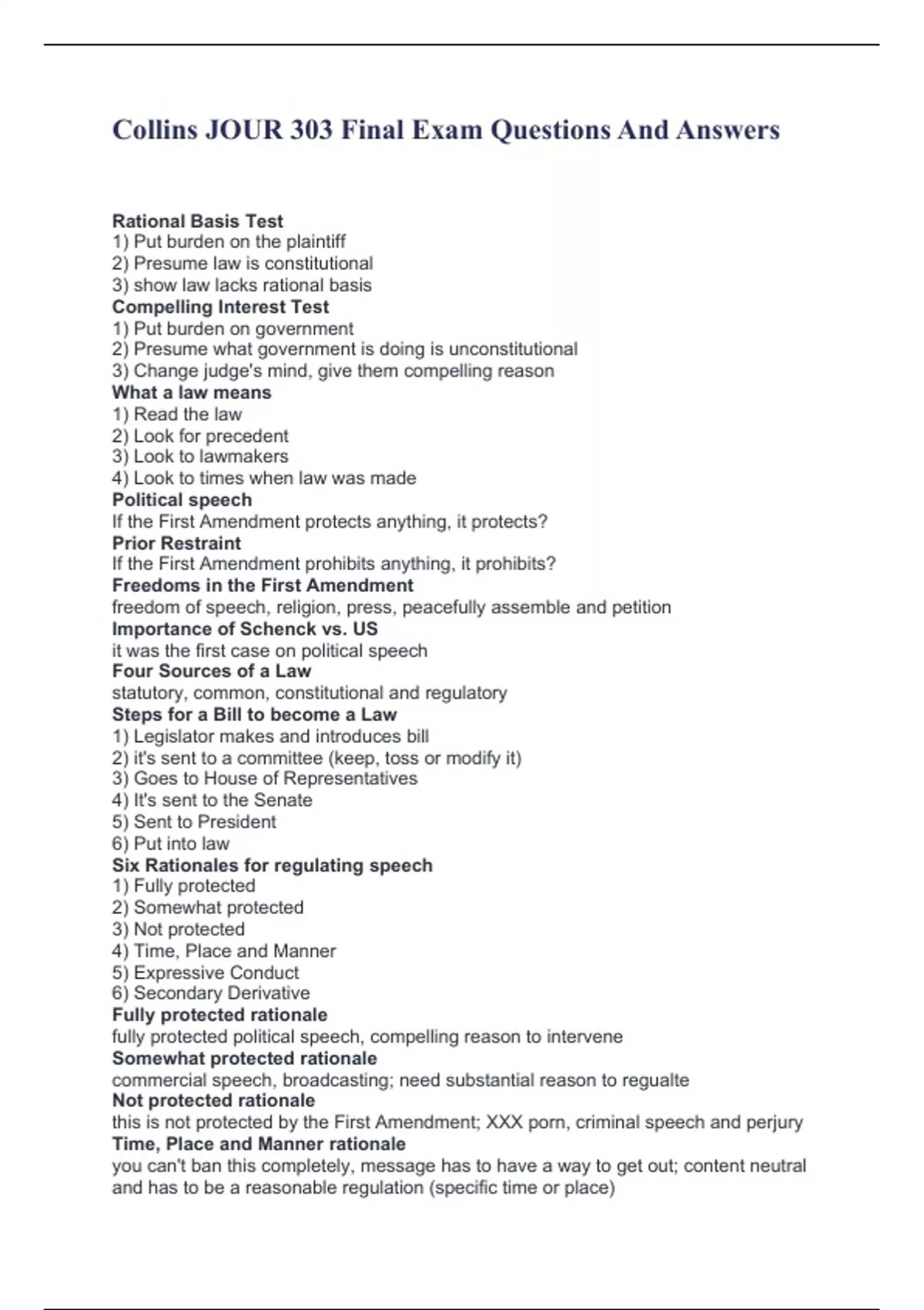 Collins JOUR 303 Final Exam Questions And Answers Rational Basis Test 1) Put burden on the plaintiff 2) Presume law is constitutional 3) show law lacks rational basis Compelling Interest Test 1) Put burden on government 2) Presume what government is doing is unconstitutional 3) Change judge's mind, give them compelling reason What a law means 1) Read the law 2) Look for precedent 3) Look to lawmakers 4) Look to times when law was made Political speech If the First Amendment protects anything, it protects? Prior Restraint If the First Amendment prohibits anything, it prohibits? Freedoms in the First Amendment freedom of speech, religion, press, peacefully assemble and petition Importance of Schenck vs. US it was the first case on political speech Four Sources of a Law statutory, common, constitutional and regulatory Steps for a Bill to become a Law 1) Legislator makes and introduces bill 2) it's sent to a committee (keep, toss or modify it) 3) Goes to House of Representatives 4) It's sent to the Senate 5) Sent to President 6) Put into law Six Rationales for regulating speech 1) Fully protected 2) Somewhat protected 3) Not protected 4) Time, Place and Manner 5) Expressive Conduct 6) Secondary Derivative Fully protected rationale fully protected political speech, compelling reason to intervene Somewhat protected rationale commercial speech, broadcasting; need substantial reason to regualte Not protected rationale this is not protected by the First Amendment; XXX porn, criminal speech and perjury Time, Place and Manner rationale you can't ban this completely, message has to have a way to get out; content neutral and has to be a reasonable regulation (specific time or place)