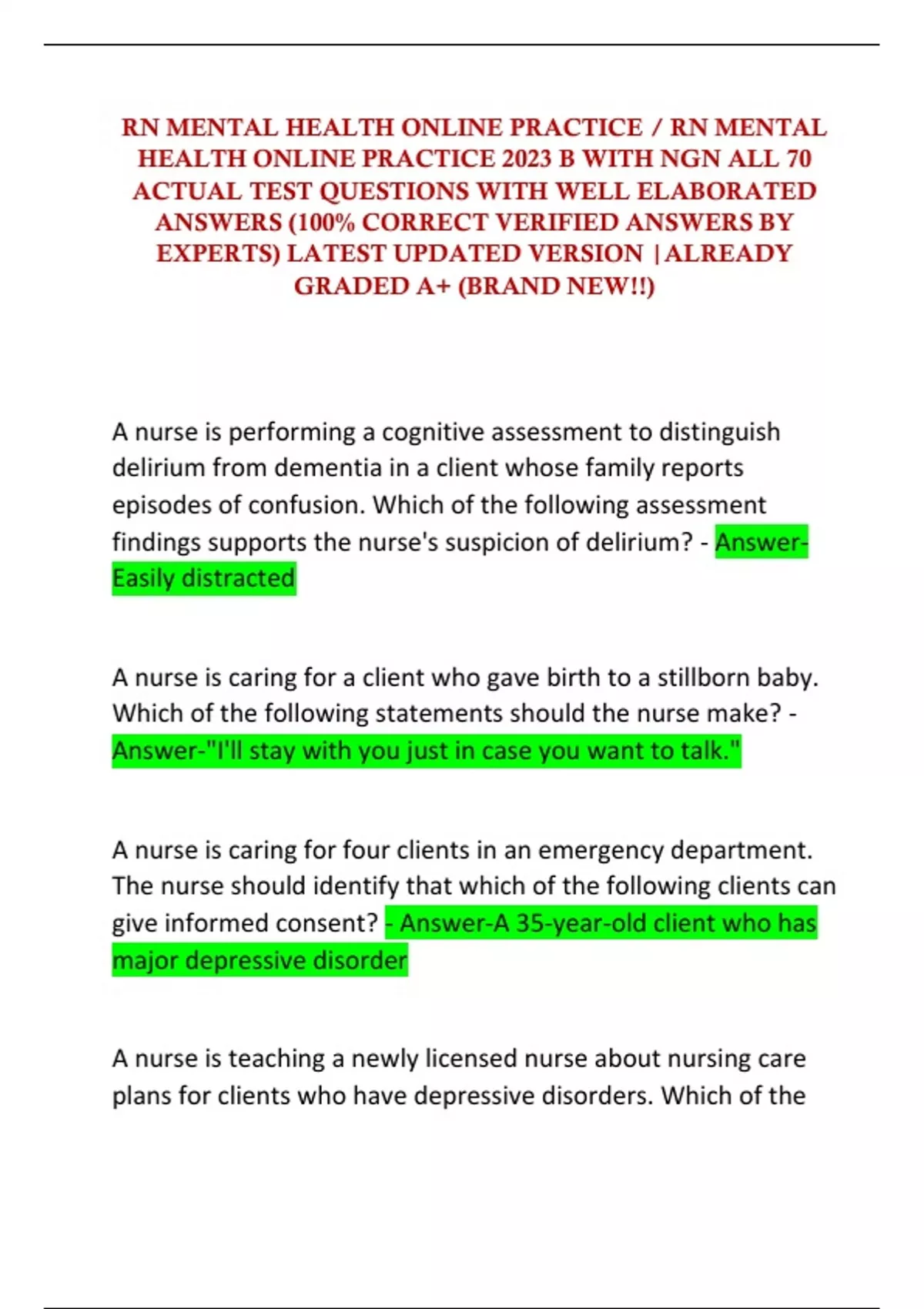 RN MENTAL HEALTH ONLINE PRACTICE / RN MENTAL HEALTH ONLINE PRACTICE 2023 B WITH NGN ALL 70 ACTUAL TEST QUESTIONS WITH WELL ELABORATED ANSWERS (100% CORRECT VERIFIED ANSWERS BY EXPERTS) LATEST UPDATED VERSION |ALREADY GRADED A+ (BRAND NEW!!)