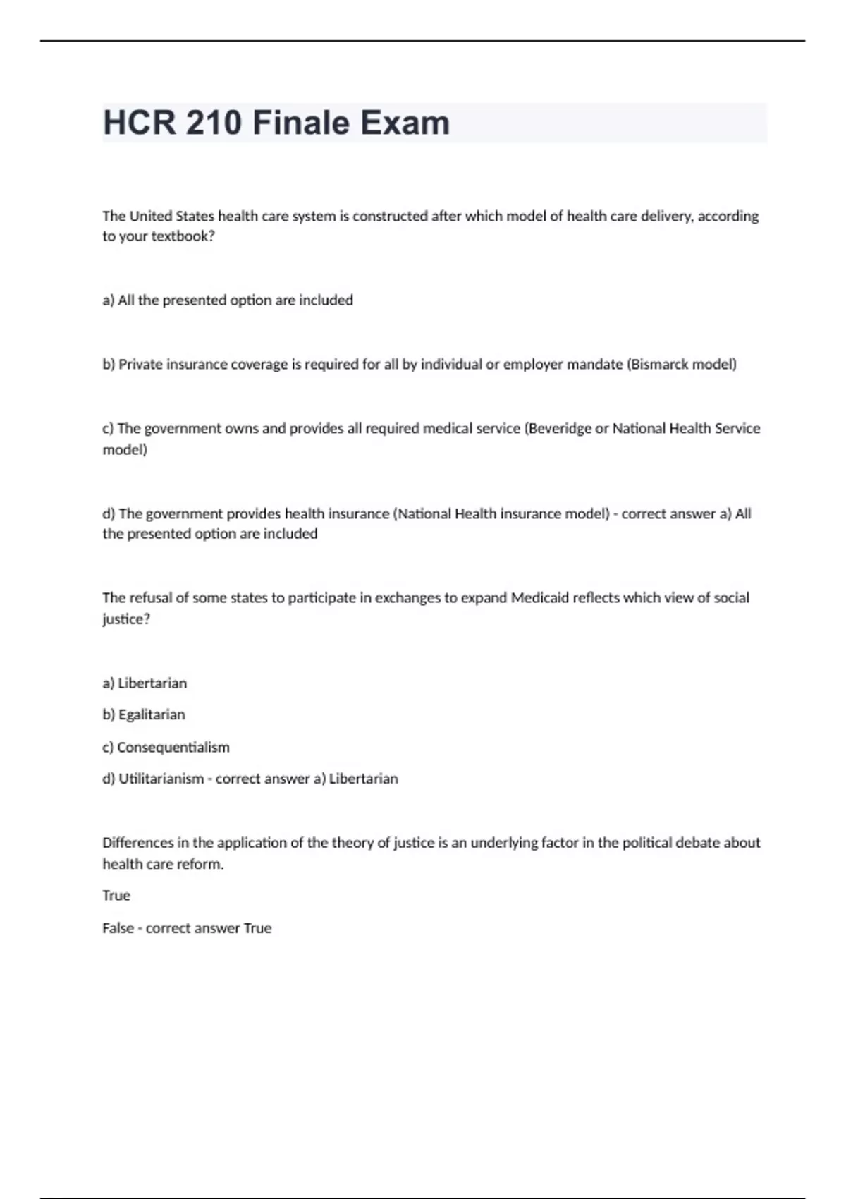 HCR 210 Finale ExamThe United States health care system is constructed after which model of health care delivery, according to your textbook? a) All the presented option are included b) Private insurance coverage is required for all by individual or employer mandate (Bismarck model) c) The government owns and provides all required medical service (Beveridge or National Health Service model) d) The government provides health insurance (National Health insurance model) - correct answer a) All the presented option are included The refusal of some states to participate in exchanges to expand Medicaid reflects which view of social justice? a) Libertarian b) Egalitarian c) Consequentialism d) Utilitarianism - correct answer a) Libertarian Differences in the application of the theory of justice is an underlying factor in the political debate about health care reform. True False - correct answer True