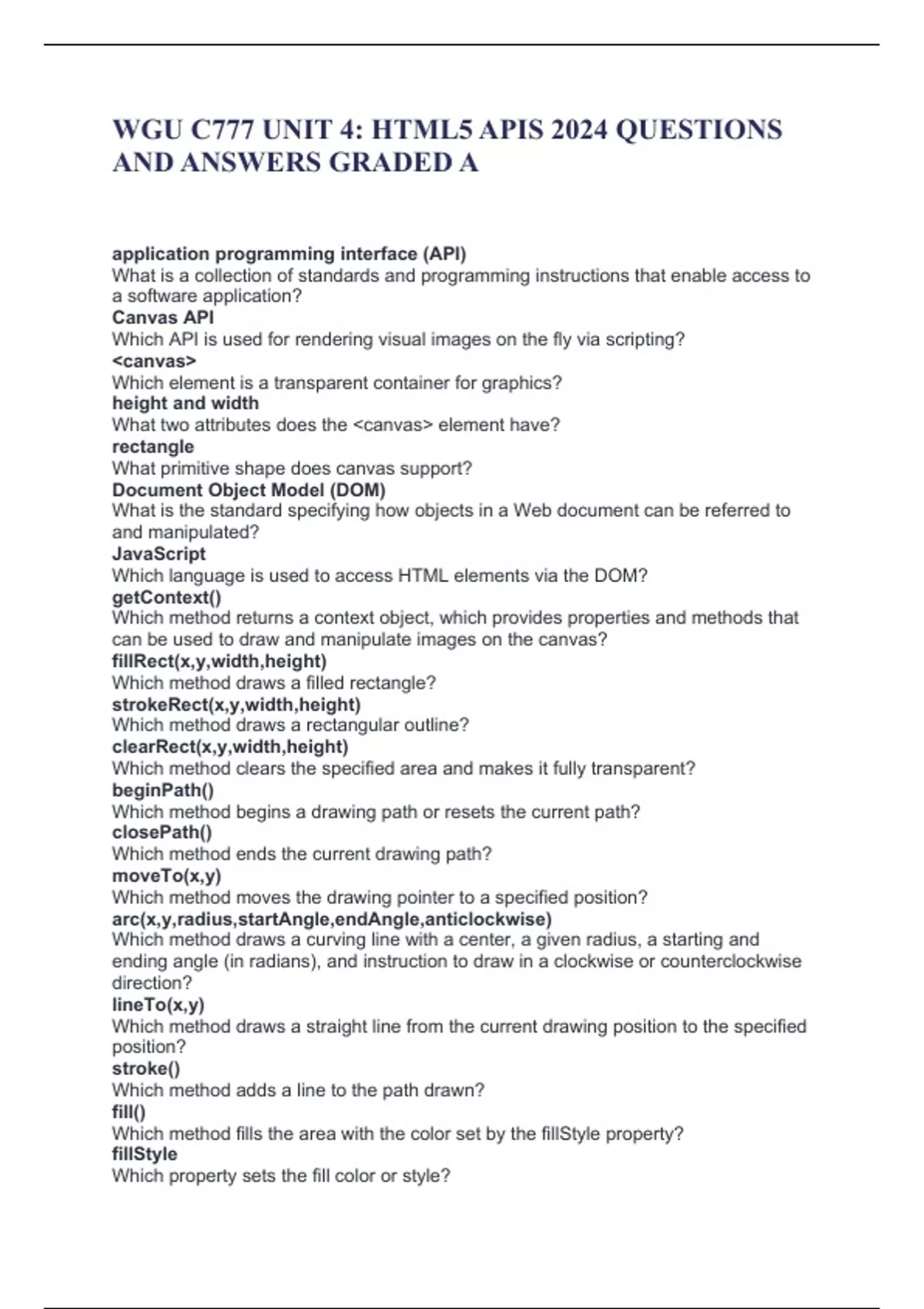 WGU C777 UNIT 4: HTML5 APIS 2024 QUESTIONS AND ANSWERS GRADED A application programming interface (API) What is a collection of standards and programming instructions that enable access to a software application? Canvas API Which API is used for rendering visual images on the fly via scripting? <canvas> Which element is a transparent container for graphics? height and width What two attributes does the <canvas> element have? rectangle What primitive shape does canvas support? Document Object Model (DOM) What is the standard specifying how objects in a Web document can be referred to and manipulated? JavaScript Which language is used to access HTML elements via the DOM? getContext() Which method returns a context object, which provides properties and methods that can be used to draw and manipulate images on the canvas? fillRect(x,y,width,height) Which method draws a filled rectangle? strokeRect(x,y,width,height) Which method draws a rectangular outline? clearRect(x,y,width,height) Which method clears the specified area and makes it fully transparent? beginPath() Which method begins a drawing path or resets the current path? closePath() Which method ends the current drawing path? moveTo(x,y) Which method moves the drawing pointer to a specified position? arc(x,y,radius,startAngle,endAngle,anticlockwise) Which method draws a curving line with a center, a given radius, a starting and ending angle (in radians), and instruction to draw in a clockwise or counterclockwise direction? lineTo(x,y) Which method draws a straight line from the current drawing position to the specified position? stroke() Which method adds a line to the path drawn? fill() Which method fills the area with the color set by the fillStyle property? fillStyle Which property sets the fill color or style?