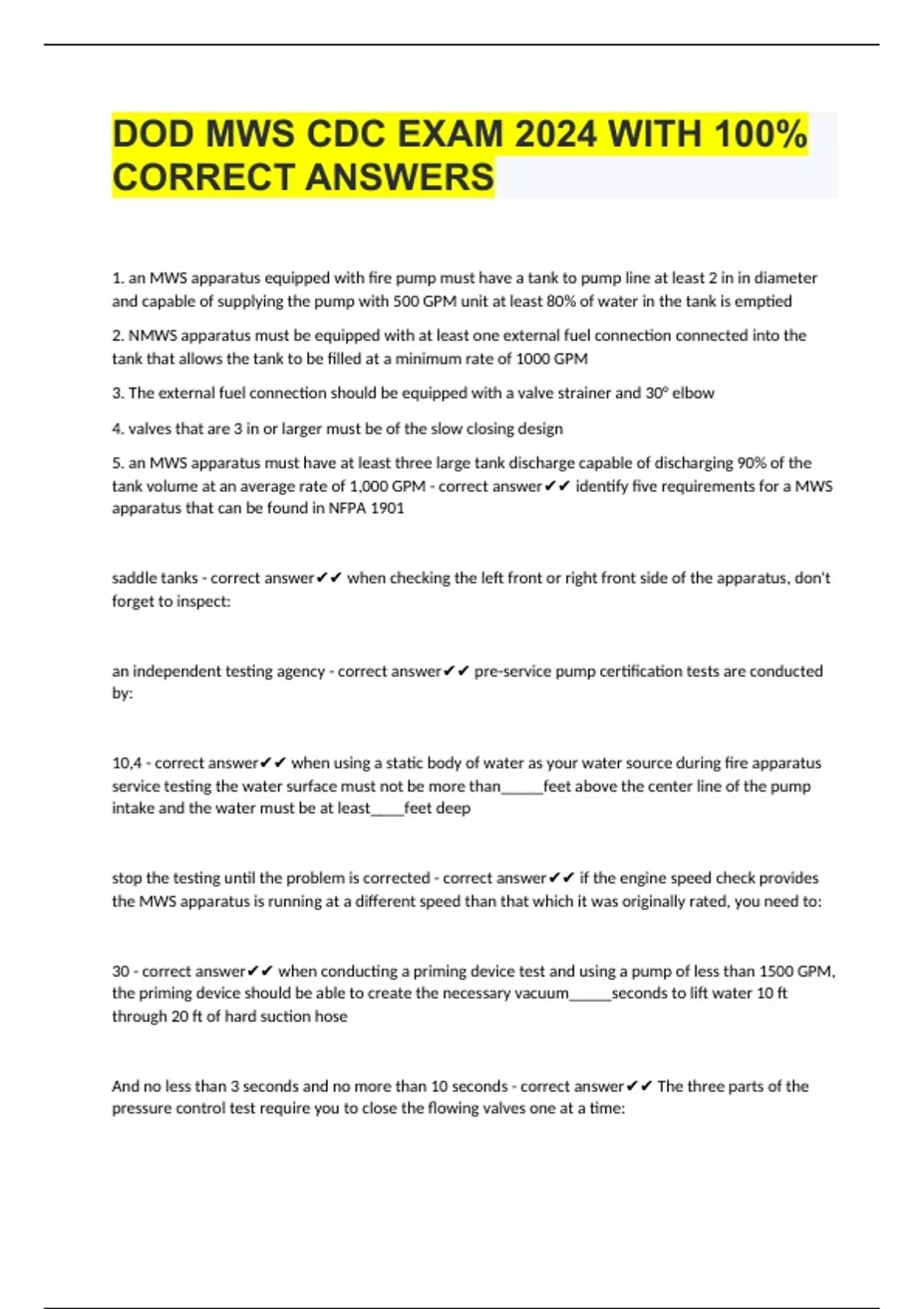 DOD MWS CDC EXAM 2024 WITH 100% CORRECT ANSWERS 1. an MWS apparatus equipped with fire pump must have a tank to pump line at least 2 in in diameter and capable of supplying the pump with 500 GPM unit at least 80% of water in the tank is emptied 2. NMWS apparatus must be equipped with at least one external fuel connection connected into the tank that allows the tank to be filled at a minimum rate of 1000 GPM 3. The external fuel connection should be equipped with a valve strainer and 30° elbow 4. valves that are 3 in or larger must be of the slow closing design 5. an MWS apparatus must have at least three large tank discharge capable of discharging 90% of the tank volume at an average rate of 1,000 GPM - correct answer identify five requirements for a MWS apparatus that can be found in NFPA 1901 saddle tanks - correct answer when checking the left front or right front side of the apparatus, don't forget to inspect: an independent testing agency - correct answer pre-service pump certification tests are conducted by: 10,4 - correct answer when using a static body of water as your water source during fire apparatus service testing the water surface must not be more than_____feet above the center line of the pump intake and the water must be at least____feet deep stop the testing until the problem is corrected - correct answer if the engine speed check provides the MWS apparatus is running at a different speed than that which it was originally rated, you need to: 30 - correct answer when conducting a priming device test and using a pump of less than 1500 GPM, the priming device should be able to create the necessary vacuum_____seconds to lift water 10 ft through 20 ft of hard suction hose