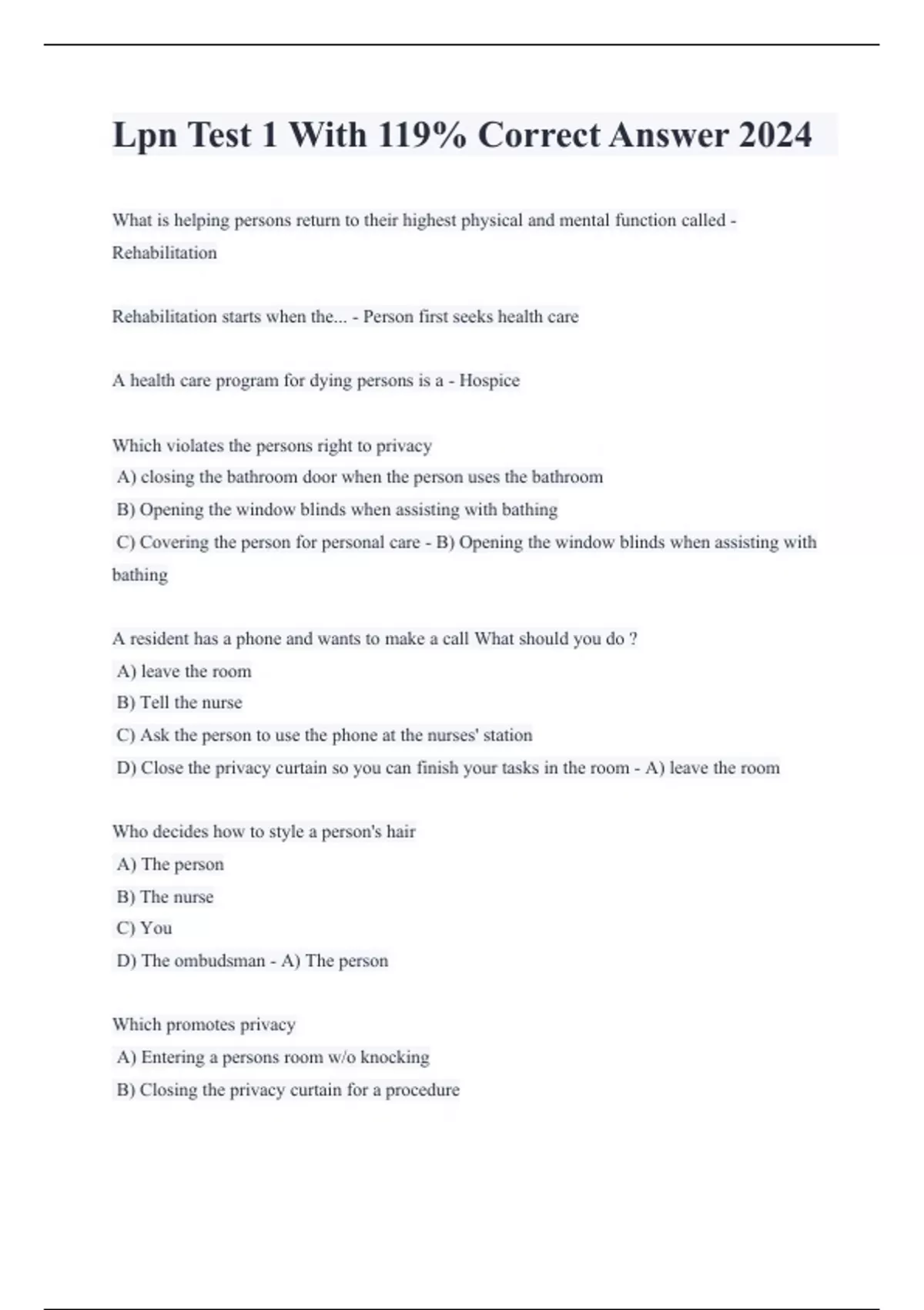 Lpn Test 1 With 119% Correct Answer 2024