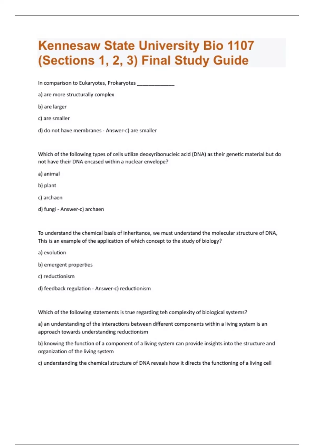 Kennesaw State University Bio 1107 (Sections 1, 2, 3) Final Study Guide Questions And Answers With Verified Solutions