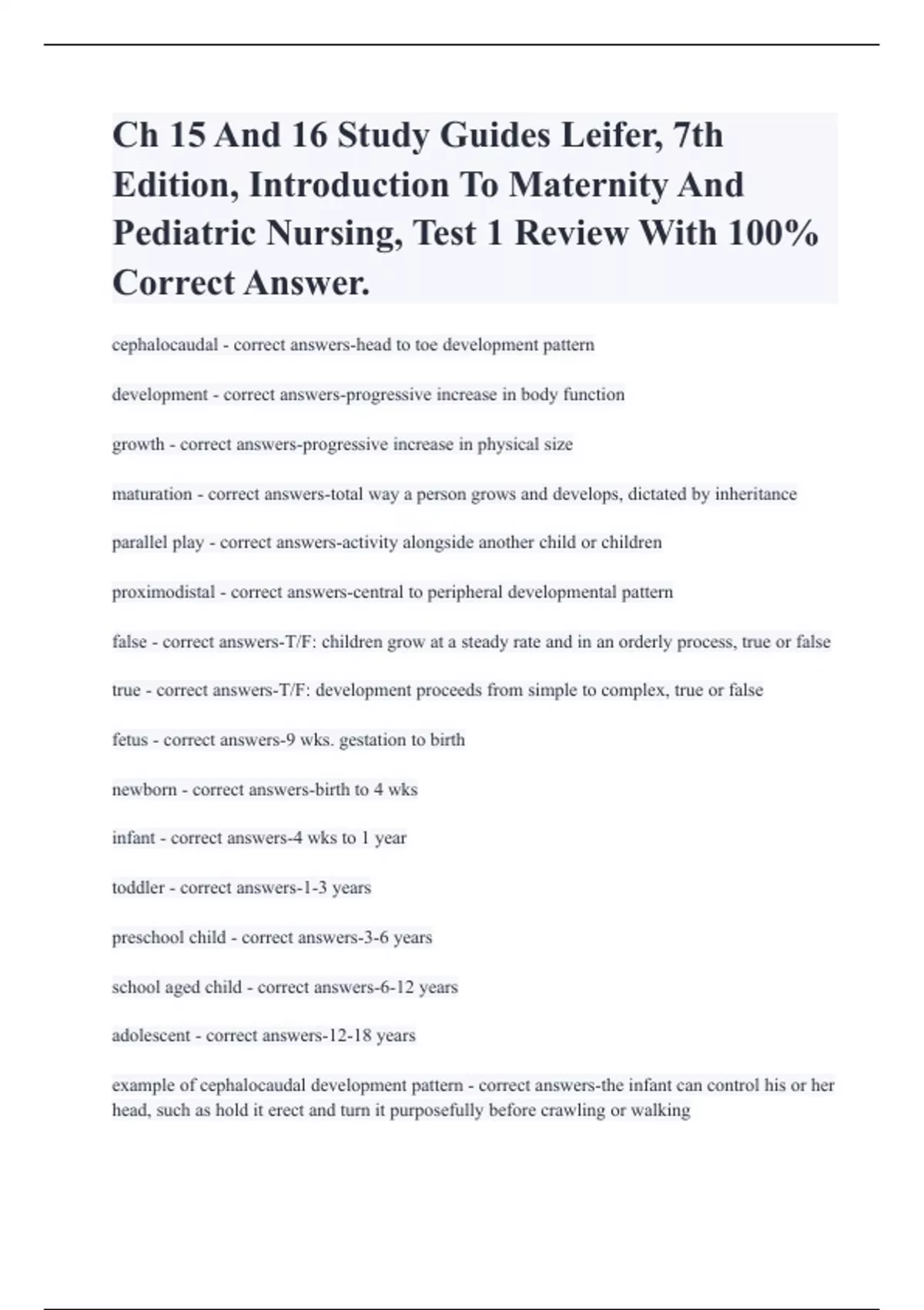 Ch 15 And 16 Study Guides Leifer, 7th Edition, Introduction To Maternity And Pediatric Nursing, Test 1 Review With 100% Correct Answer.