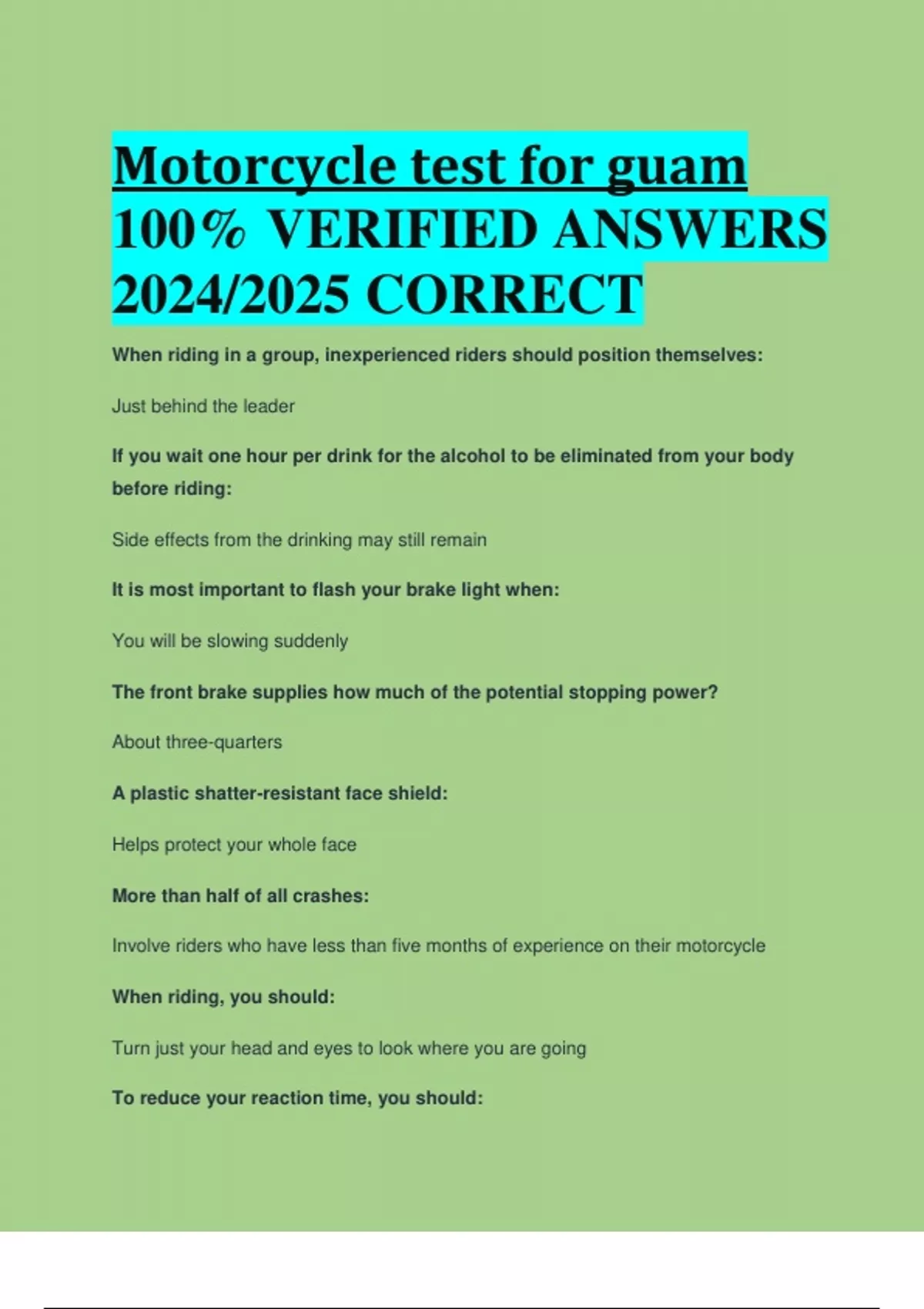 Motorcycle test for guam 100% VERIFIED ANSWERS 2024/2025 CORRECT
