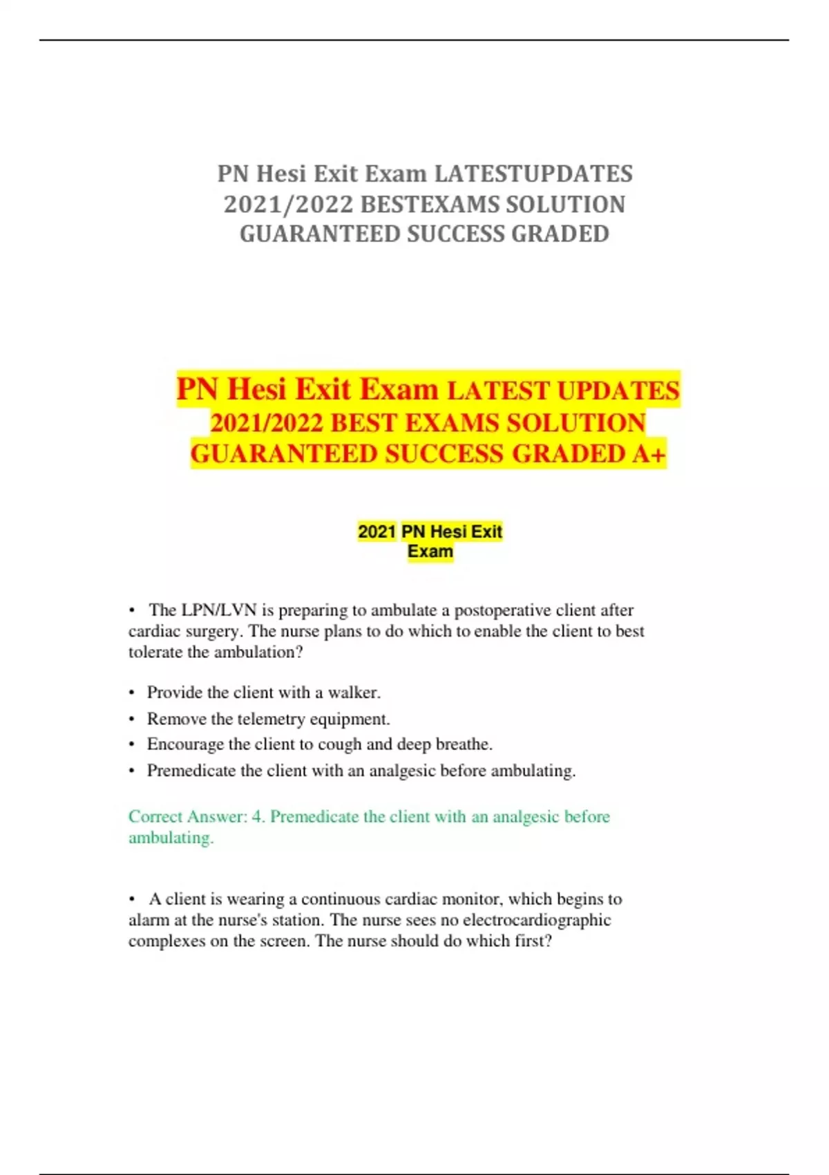 PN Hesi Exit Exam LATEST UPDATES 2021/2022 BEST EXAMS SOLUTION GUARANTEED SUCCESS GRADED A+ 2021 PN Hesi Exit Exam • The LPN/LVN is preparing to ambulate a postoperative client after cardiac surgery. The nurse plans to do which to enable the client to best tolerate the ambulation? • Provide the client with a walker. • Remove the telemetry equipment. • Encourage the client to cough and deep breathe. • Premedicate the client with an analgesic before ambulating. Correct Answer: 4. Premedicate the client with an analgesic before ambulating. • A client is wearing a continuous cardiac monitor, which begins to alarm at the nurse's station. The nurse sees no electrocardiographic complexes on the screen. The nurse should do which first? • Call a code blue. • Call the health care provider. • Check the client status and lead placement. • Press the recorder button on the ECG console. Correct Answer: 3. Check the client status and lead placement. • The LPN/LVN in a medical unit is caring for a client with heart failure. The client suddenly develops extreme dyspnea, tachycardia, and lung crackles, and the nurse suspects pulmonary edema. The nurse immediately notifies the registered nurse and expects which PN Hesi Exit Exam LATEST UPDATES 2021/2022 BEST EXAMS SOLUTION GUARANTEED SUCCESS GRADED A+ interventions to be prescribed? Select all that apply. • Administering oxygen • Inserting a Foley catheter • Administering furosemide (Lasix) • Administering morphine sulfate intravenously • Transporting the client to the coronary care unit PN Hesi Exit Exam LATEST UPDATES 2021/2022 BEST EXAMS SOLUTION GUARANTEED SUCCESS GRADED A+ • Placing the client in a low-Fowler's side-lying position Correct Answer: • Administering oxygen • Inserting a Foley catheter • Administering furosemide (Lasix) • The clinic nurse is obtaining cardiovascular data on a client. The LPN/LVN prepares to check the client's apical pulse and places the stethoscope in which position? • Midsternum equal with the nipple line • At the midaxillary line on the left side of the chest • At the midline of the chest just below the xiphoid process • At the midclavicular line at the fifth left intercostal space Correct Answer: 4. At the midclavicular line at the fifth left intercostalspace • The LPN/LVN is caring for a client who has been admitted to the hospital with a diagnosis of angina pectoris. The client is receiving oxygen via nasal cannula at 2 L. The client asks the nurse why theoxygen is necessary. The LPN/LVN bases the response on which information? • Oxygen assists in calming the client. • Oxygen prevents the development of any thrombus formation. • Deficient oxygenation to heart cells results in angina pectoris pain. PN Hesi Exit Exam LATEST UPDATES 2021/2022 BEST EXAMS SOLUTION GUARANTEED SUCCESS GRADED A+ • Oxygen dilates the blood vessels, supplying more nutrients to the heart muscle. Correct Answer: 3. Deficient oxygenation to heart cells results in angina pectoris pain. • The licensed practical nurse (LPN) is assisting in caring for a clientwith a diagnosis of myocardial infarction (MI). The client is experiencing chest pain that is unrelieved by the administration of nitroglycerin. The registered nurse administers morphine sulfate to the client as prescribed by the health care provider. Following administrationof the morphine sulfate, the LPN plans to monitor which indicator(s)? • Mental status • Urinary output • Respirations and blood pressure • Temperature and blood pressure Correct Answer: 3. Respirations and blood pressure • The nurse is monitoring a client following cardioversion. Which observations should be of highest priority to the nurse? • Blood pressure • Status of airway • Oxygen flow rate • Level of consciousness Correct Answer: 2. Status of airway PN Hesi Exit Exam LATEST UPDATES 2021/2022 BEST EXAMS SOLUTION GUARANTEED SUCCESS GRADED A+ • The nurse is assisting in caring for the client immediately after insertion of a permanent demand pacemaker via the right subclavian vein. The nurse prevents dislodgement of the pacing catheter by implementing which intervention? • Limiting movement and abduction of the left arm • Limiting movement and abduction of the right arm • Assisting the client to get out of bed and ambulate with a walker • Having the physical therapist do active range of motion to the rightarm Correct Answer: 2. Limiting movement and abduction of the right arm • A client diagnosed with thrombophlebitis 1 day ago suddenly complains of chest pain and shortness of breath, and the client is visibly anxious. The LPN/LVN understands that a life-threatening complicationof this condition is which? • Pneumonia PN Hesi Exit Exam LATEST UPDATES 2021/2022 BEST EXAMS SOLUTION GUARANTEED SUCCESS GRADED A+ • Pulmonary edema • Pulmonary embolism • Myocardial infarction Correct Answer: 3. Pulmonary embolism