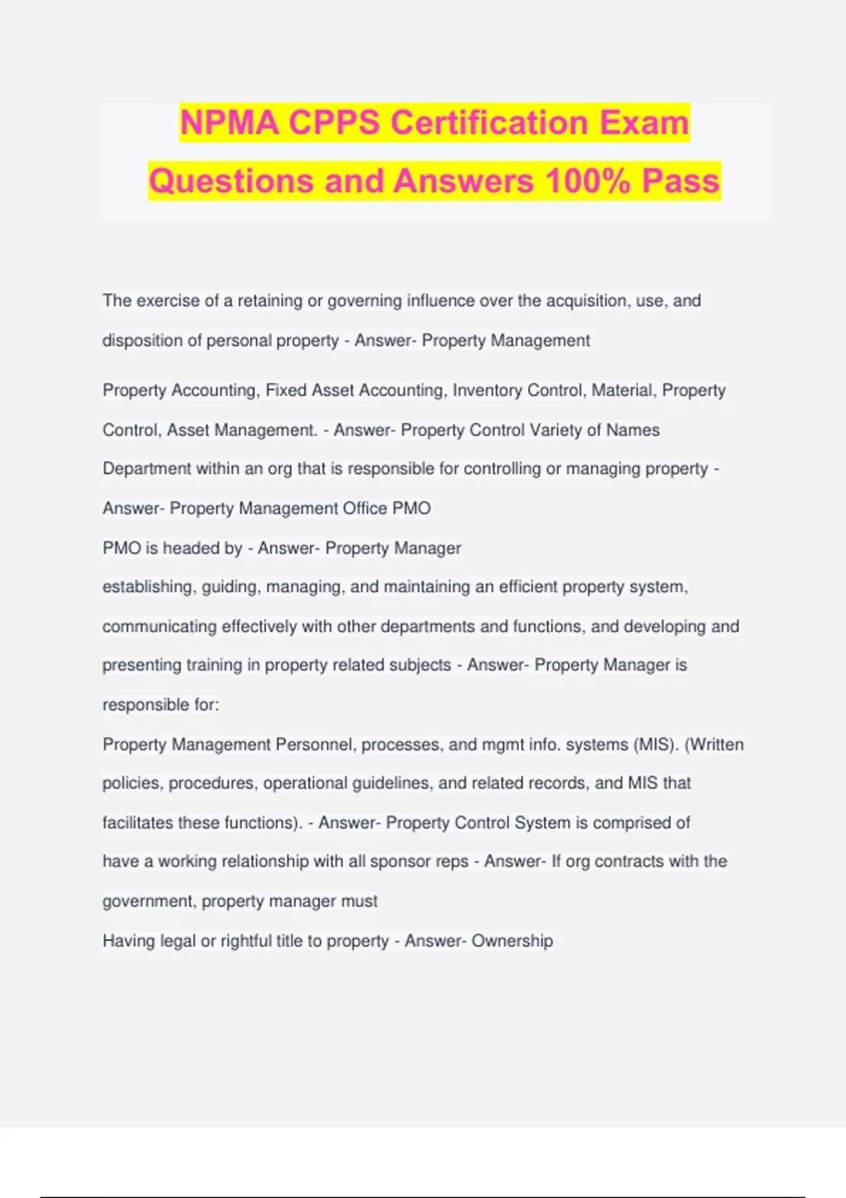 NPMA CPPS Certification Exam Questions and Answers 100% Pass The exercise of a retaining or governing influence over the acquisition, use, and disposition of personal property - Answer- Property Management Property Accounting, Fixed Asset Accounting, Inventory Control, Material, Property Control, Asset Management. - Answer- Property Control Variety of Names Department within an org that is responsible for controlling or managing property - Answer- Property Management Office PMO PMO is headed by - Answer- Property Manager establishing, guiding, managing, and maintaining an efficient property system, communicating effectively with other departments and functions, and developing and presenting training in property related subjects - Answer- Property Manager is responsible for: Property Management Personnel, processes, and mgmt info. systems (MIS). (Written policies, procedures, operational guidelines, and related records, and MIS that facilitates these functions). - Answer- Property Control System is comprised of have a working relationship with all sponsor reps - Answer- If org contracts with the government, property manager must Having legal or rightful title to property - Answer- Ownership Property is either owned by or provided. - Answer- either owned by the org or is provided by a sponsor under some kind of agreement (sponsor has ownership). make any and all decisions regarding the property - Answer- Ownership of property allows the owner to making and implementing effective decisions regarding the property - Answer- It is the property professional job to support the property owner in documented in a formal agreement between the provider and the recipient (contract, grant) - Answer- Duties, responsibilities, and potential penalties should be means to posses and have use of the property of another with delegated duties and responsibilities, subject to penalty in case of default. - Answer- Accountability do not have legal or rightful title to the property - Answer- Those accountable provider, recipient, specific duties and responsibilities, and penalties in case of default - Answer- Key elements of property accountability Contractor is accountable to government. If gov. provides funding to acquire the property, NASA is accountable to government. - Answer- Who is accountable to who for property? When accountability shifts from one entity to another.... may or may not include physical relocation of assets, but will always include a change in accountability for the property - Answer- Transfer of accountability both must have appropriate levels of mgmt authority approval, and both contracting officers need to approve - Answer- Approvals for giving and accepting orgs must be obtain before the transfer occurs, in writing, either within award doc, a letter, or email, and made part of the file for audit trail - Answer- Approvals for transfers date of transfer, the purpose of the transfer, description of property, contract numbers - Answer- transfer doc must include These occur routinely within orgs, usually result of org changes, shift of work between departments, or excess assets are needed by another department - A